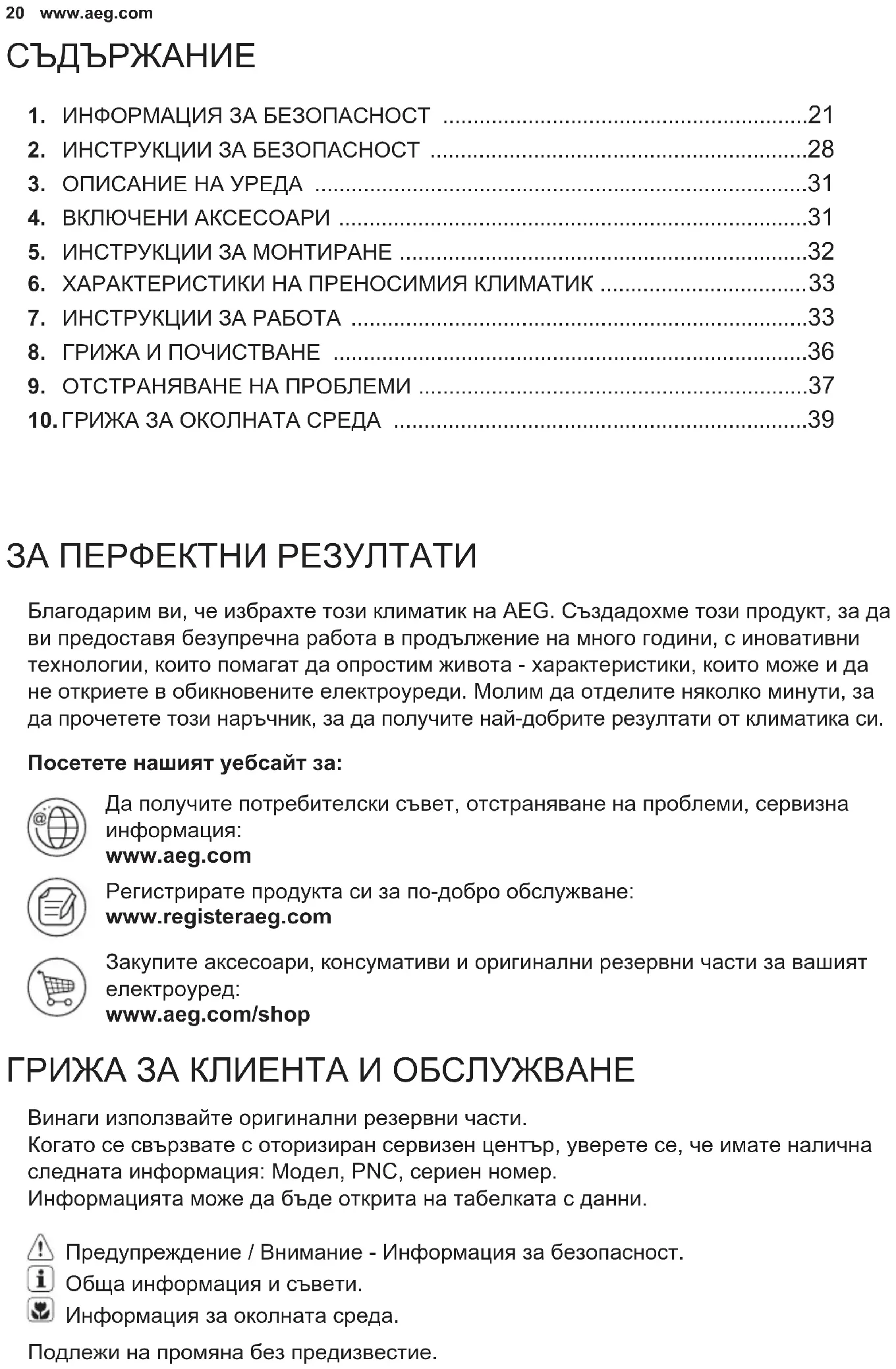 ENVIRONMENTAL CONCERNS Recycle the materials with the symbol. Put the packaging in applicable containers to recycle it. Help protect the environment and human health and to recycle waste of electrical and electronic appliances. Do not dispose appliances marked with the symbol with the household waste. Return the product to your local recycling facility or contact your municipaloffice. The software in the unit is partly based on free and open source software. To see the full copyright information and applicable license terms, please visit: https://emtech.delta.electrolux.com/license For more information visit www.electrolux.com20 www.aeg.com Подлежи на промяна без предизвестие. ЗА ПЕРФЕКТНИ РЕЗУЛТАТИ ГРИЖА ЗА КЛИЕНТА И ОБСЛУЖВАНЕ Благодарим ви, че избрахте този климатик на AEG. Създадохме този продукт, за да ви предоставя безупречна работа в продължение на много години, с иновативни технологии, които помагат да опростим живота - характеристики, които може и да не откриете в обикновените електроуреди. Молим да отделите няколко минути, за да прочетете този наръчник, за да получите най-добрите резултати от климатика си. Винаги използвайте оригинални резервни части. Когато се свързвате с оторизиран сервизен център, уверете се, че имате налична следната информация: Модел, PNC, сериен номер. Информацията може да бъде открита на табелката с данни. Посетете нашият уебсайт за: Да получите потребителски съвет, отстраняване на проблеми, сервизна информация: www.aeg.com Регистрирате продукта си за по-добро обслужване: www.regieraeg.com Закупите аксесоари, консумативи и оригинални резервни части за вашият електроуред: www.aeg.com/shop