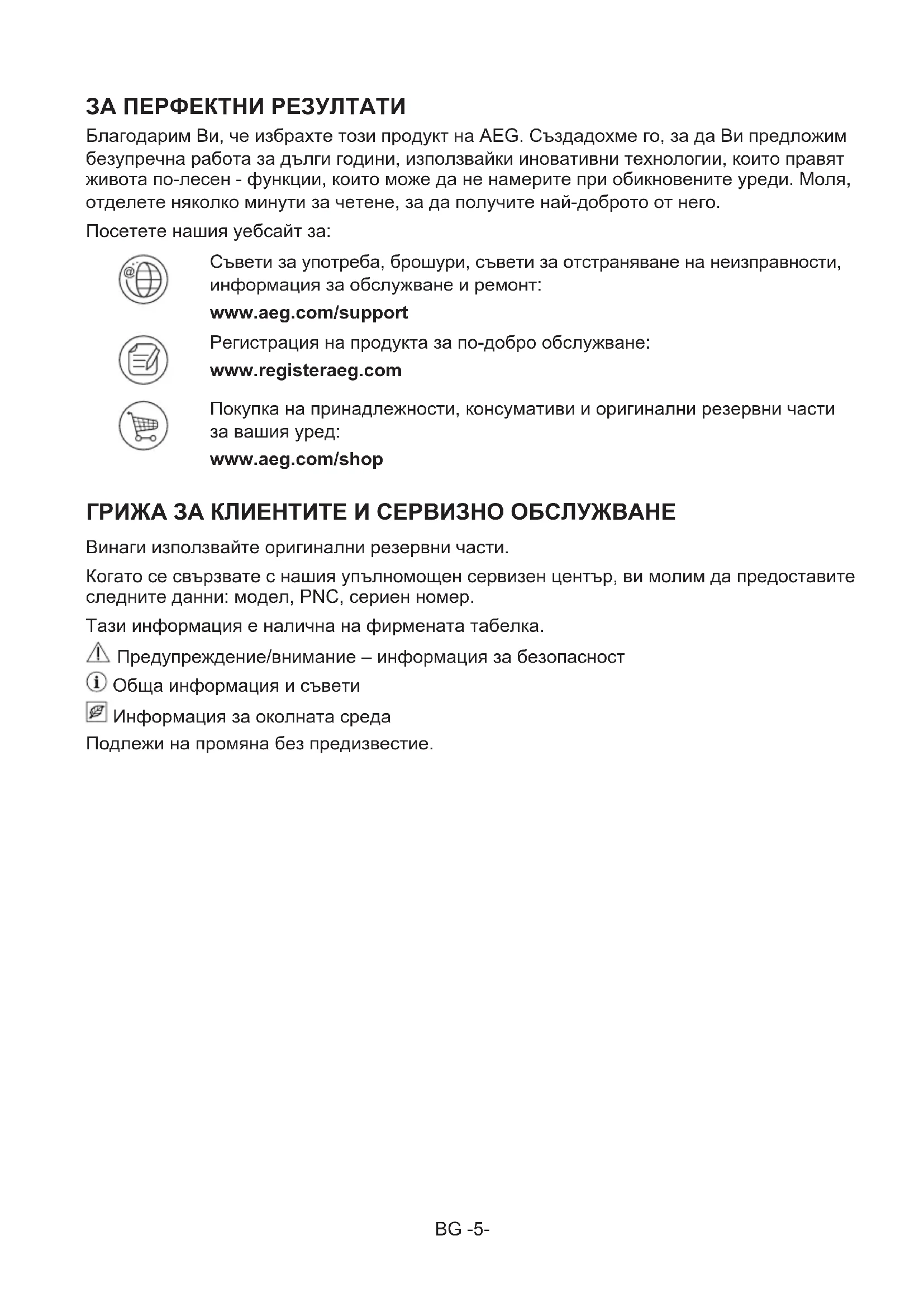 - ИНФОРМАЦИЯ ЗА ИЗПИТВАТЕЛНИ ИНСТИТУТИ BG -5- ЗА ПЕРФЕКТНИ РЕЗУЛТАТИ Благодарим Ви, че избрахте този продукт на AEG. Създадохме го, за да Ви предложим безупречна работа за дълги години, използвайки иновативни технологии, които правят живота по-лесен - функции, които може да не намерите при обикновените уреди. Моля, отделете няколко минути за четене, за да получите най-доброто от него. Посетете нашия уебсайт за: Съвети за употреба, брошури, съвети за отстраняване на неизправности, информация за обслужване и ремонт: www.aeg.com/support Регистрация на продукта за по-добро обслужване: www.registeraeg.com Покупка на принадлежности, консумативи и оригинални резервни части за вашия уред: www.aeg.com/shop ГРИЖА ЗА КЛИЕНТИТЕ И СЕРВИЗНО ОБСЛУЖВАНЕ Винаги използвайте оригинални резервни части. Когато се свързвате с нашия упълномощен сервизен център, ви молим да предоставите следните данни: модел, PNC, сериен номер. Тази информация е налична на фирмената табелка. Предупреждение/внимание – информация за безопасност Обща информация и съвети Информация за околната среда Подлежи на промяна без предизвестие.BG -6- ПРЕДИ ДА ИЗПОЛЗВАТЕ УРЕДАРАЗДЕЛ -1 Общи предупреждения Моля, прочетете внимателно инструкциите, преди да монтирате или използвате уреда. Ние не носим отговорност за щети, причинени от неправилна употреба. Следвайте всички инструкции на върху уреда и наръчника с инструкции, и съхранявайте този наръчник на сигурно място, за да отстраните проблеми, които може да възникнат p. 37