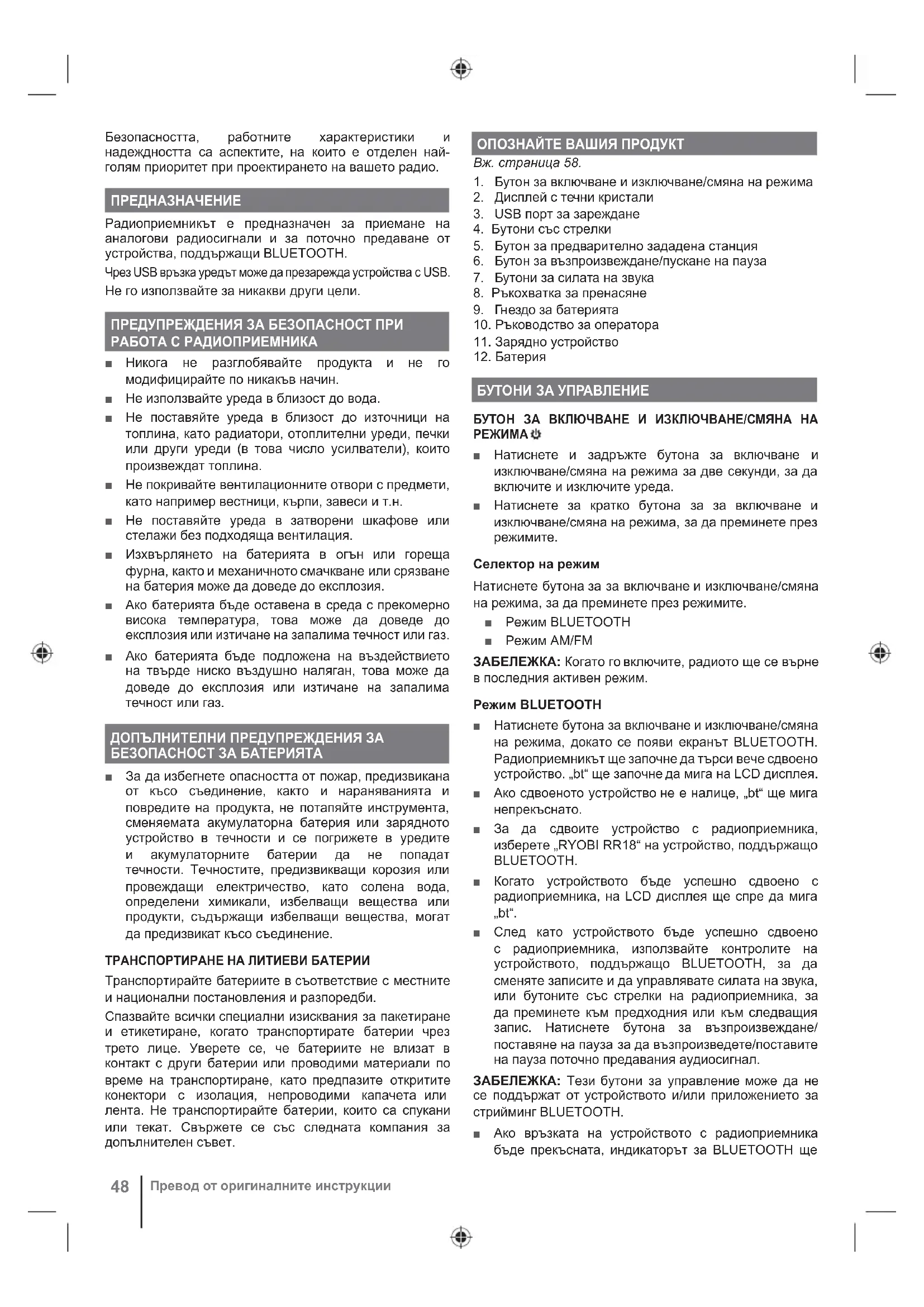 ELБезопасността, работните характеристики и надеждността са аспектите, на които е отделен най- голям приоритет при проектирането на вашето радио. ПРЕДНАЗНАЧЕНИЕ Радиоприемникът е предназначен за приемане на аналогови радиосигнали и за поточно предаване от устройства, поддържащи BLUETOOTH. Чрез USB връзка уредът може да презарежда устройства с USB. Не го използвайте за никакви други цели. ПРЕДУПРЕЖДЕНИЯ ЗА БЕЗОПАСНОСТ ПРИ РАБОТА С РАДИОПРИЕМНИКА ■ Никога не разглобявайте продукта и не го модифицирайте по никакъв начин. ■ Не използвайте уреда в близост до вода. ■ Не поставяйте уреда в близост до източници на топлина, като радиатори, отоплителни уреди, печки или други уреди (в това число усилватели), които произвеждат топлина. ■ Не покривайте вентилационните отвори с предмети, като например вестници, кърпи, завеси и т.н. ■ Не поставяйте уреда в затворени шкафове или стелажи без подходяща вентилация. ■ Изхвърлянето на батерията в огън или гореща фурна, както и механичното смачкване или срязване на батерия може да доведе до експлозия. ■ Ако батерията бъде оставена в среда с прекомерно висока температура, това може да доведе до експлозия или изтичане на запалима течност или газ. ■ Ако батерията бъде подложена на въздействието на твърде ниско въздушно наляган, това може да доведе до експлозия или изтичане на запалима течност или газ. ДОПЪЛНИТЕЛНИ ПРЕДУПРЕЖДЕНИЯ ЗА БЕЗОПАСНОСТ ЗА БАТЕРИЯТА ■ За да избегнете опасността от пожар, предизвикана от късо съединение, както и нараняванията и повредите на продукта, не потапяйте инструмента, сменяемата акумулаторна батерия или зарядното устройство в течности и се погрижете в уредите и акумулаторните батерии да не попадат течности. Течностите, предизвикващи корозия или провеждащи електричество, като солена вода, определени химикали, избелващи вещества или продукти, съдържащи избелващи вещества, могат да предизвикат късо съединение. ТРАНСПОРТИРАНЕ НА ЛИТИЕВИ БАТЕРИИ Транспортирайте батериите в съответствие с местните и национални постановления и разпоредби. Спазвайте всички специални изисквания за пакетиране и етикетиране, когато транспортирате батерии чрез трето лице. Уверете се, че батериите не влизат в контакт с други батерии или проводими материали по време на транспортиране, като предпазите откритите конектори с изолация, непроводими капачета