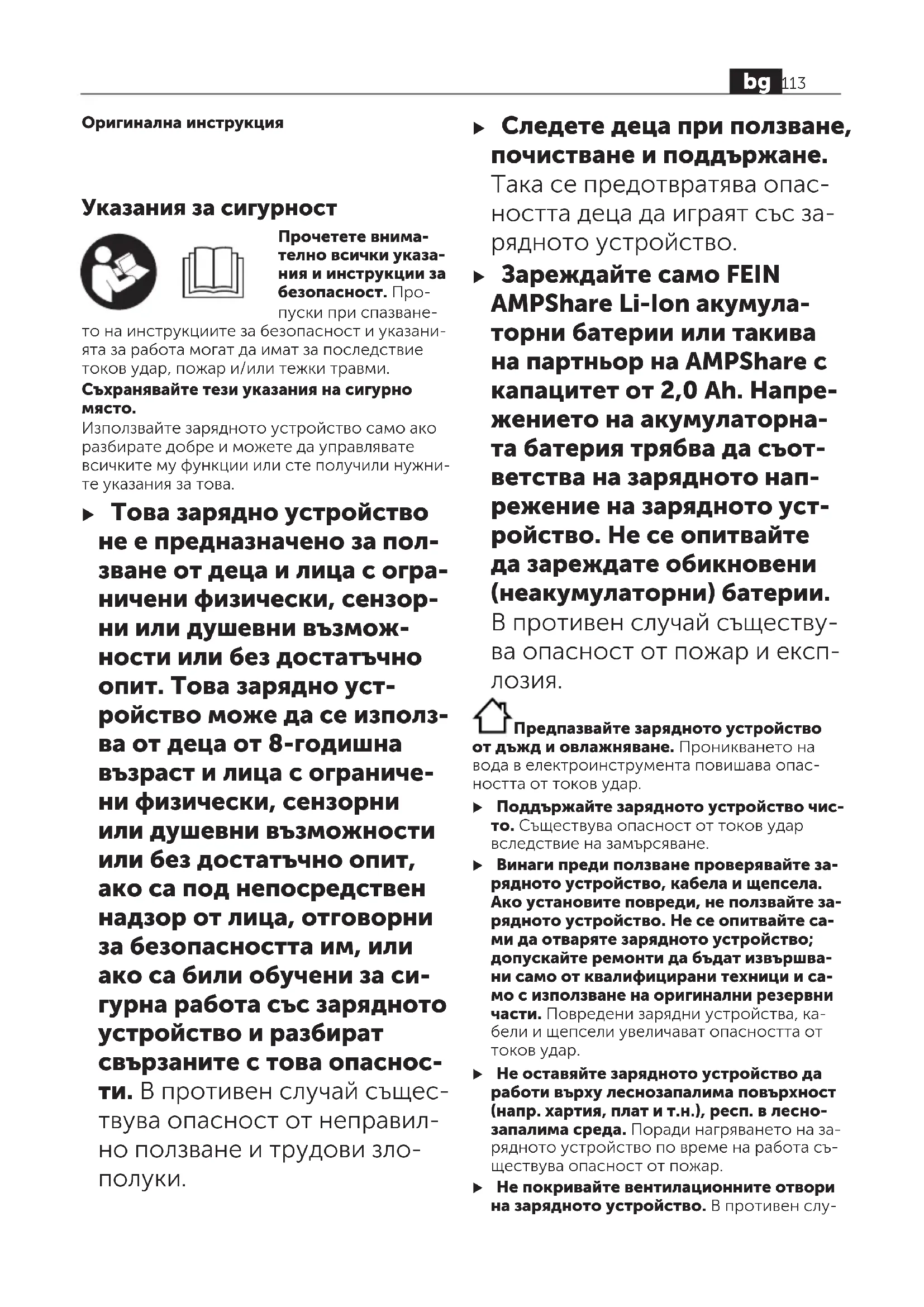 u Следете деца при ползване, почистване и поддържане. Така се предотвратява опас- ността деца да играят със за- рядното устройство. u Зареждайте самоFEIN AMPShare Li-Ion акумула- торни батерии или такива на партньор на AMPShare с капацитет от2,0Ah. Напре- жението на акумулаторна- та батерия трябва да съот- ветства на зарядното нап- режение на зарядното уст- ройство. Не се опитвайте да зареждате обикновени (неакумулаторни) батерии. В противен случай съществу- ва опасност от пожар и експ-