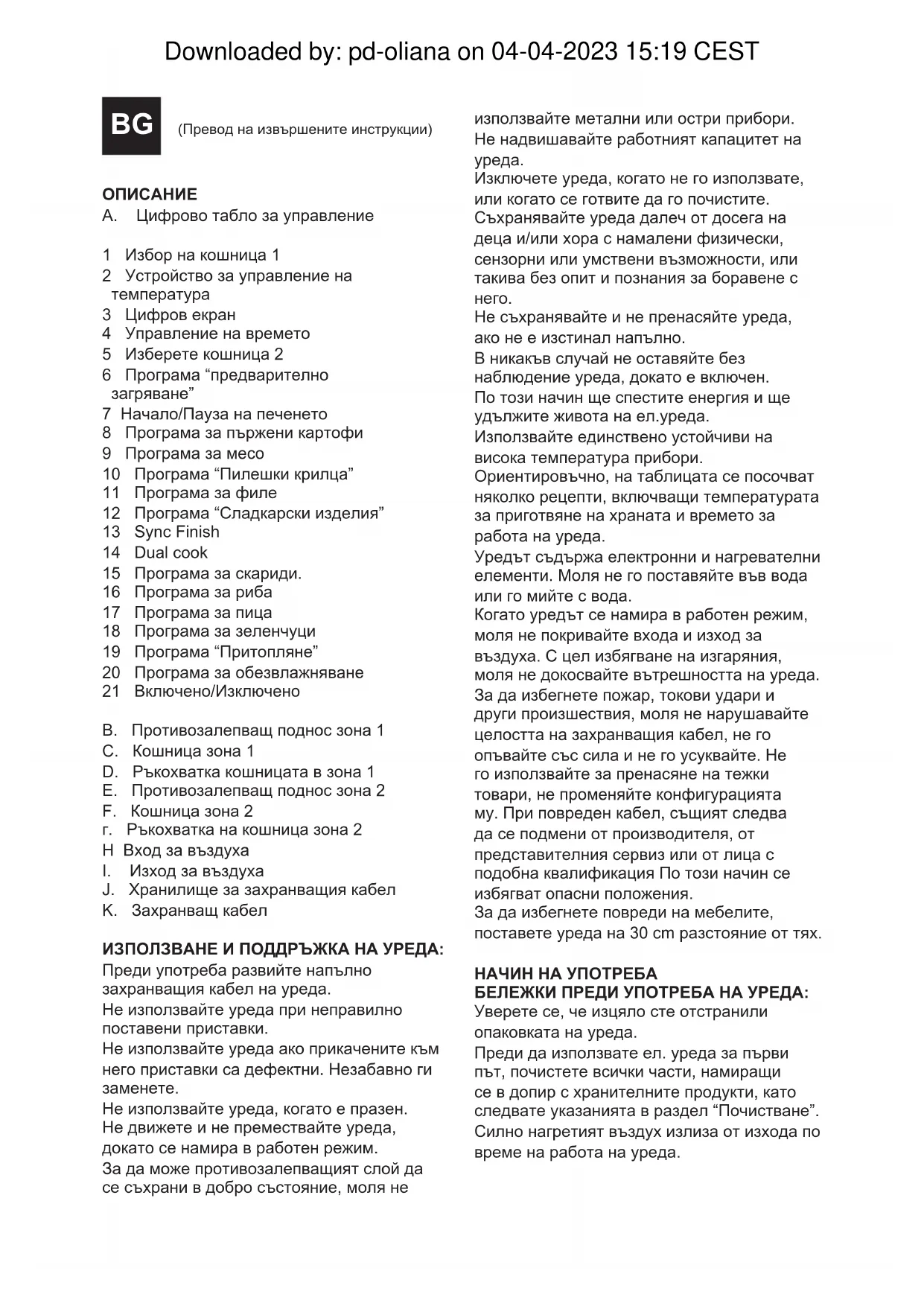 Не съхранявайте и не пренасяйте уреда, ако не е изстинал напълно. В никакъв случай не оставяйте без наблюдение уреда, докато е включен. По този начин ще спестите енергия и ще удължите живота на ел.уреда. Използвайте единствено устойчиви на висока температура прибори. Ориентировъчно, на таблицата се посочват няколко рецепти, включващи температурата за приготвяне на храната и времето за работа на уреда. Уредът съдържа електронни и нагревателни елементи. Моля не го поставяйте във вода или го мийте с вода. Когато уредът се намира в работен режим, моля не покривайте входа и изход за въздуха. С цел избягване на изгаряния, моля не докосвайте вътрешността на уреда. За да избегнете пожар, токови удари и други произшествия, моля не нарушавайте целостта на захранващия кабел, не го опъвайте със сила и не го усуквайте. Не го използвайте за пренасяне на тежки товари, не променяйте конфигурацията му. При повреден кабел, същият следва да се подмени от производителя, от представителния сервиз или от лица с подобна квалификация По този начин се избягват опасни положения. За да избегнете повреди на мебелите, поставете уреда на 30 cm разстояние от тях. НАЧИН НА УПОТРЕБА БЕЛЕЖКИ ПРЕДИ УПОТРЕБА НА УРЕДА: Уверете се, че изцяло сте отстранили опаковката на уреда. Преди да използвате ел. уреда за първи път, почистете всички части, намиращи се в допир с хранителните продукти, като следвате указанията в раздел “Почистване”. Силно нагретият въздух излиза от изхода по време на работа на уреда. Downloaded by: pd-oliana on 04-04-2023 15:19 CESTРАБОТА С УРЕДА: Преди употреба развийте напълно захранващия кабел на уреда. Включете уреда в електрическата мрежа. Внимателно извадете кошница (C, F) от фритюрника. Бележка: при боравене с кошницата винаги използвайте ръкохватката. Не пипайте кошниците, докато са нагрети. Поставете в кошничката хранителните продукти, които желаете да пържите, да печете или сготвите (C, F). Поставете отново кошницата в уреда. Включете уреда чрез съответния бутон (21). Изберете кошницата посредством бутоните за избор на кошница (1,5). Изберете една от 12-те предварително зададени програми и настройте температурата и времето посредством съответните бутони, ако това се налага (2,4). Ако желаете процесът на приготвяне в двете кошници да приключи по едно и също време, може да изберете печене в двете «Sync Finish» (13). За да може тази функция да е ефективна, следва да използвате двете кошници. Първо натиснете споменатия бутон (13), след което настройте двете зони. Ако желаете да използвате двете кошници за един и същи вид храна, можете да изберете «Dual Cook» (14) и ще се използва една и съща програма за двете зони. За тази функция, натиснете бутона (14), след което - желаната програма. Натиснете бутона „Начало“/ „Пауза“ (7), за да започнете да готвите. Темпоризаторът започва работа. Бележка: моля имайте предвид, че при студен уред следва да прибавите три минути към времето за приготвяне на хранителните продукти. Бележка: Ако желаете да стръскате хранителните насред готвенето, можете просто да извадите кошницата от вътрешността на уреда и да ги стръскате. Горното действие не ще засегне значително процеса на готвене. ВНИМАНИЕ: Както кошницата, подноса, така и хранителните продукти са МНОГО
