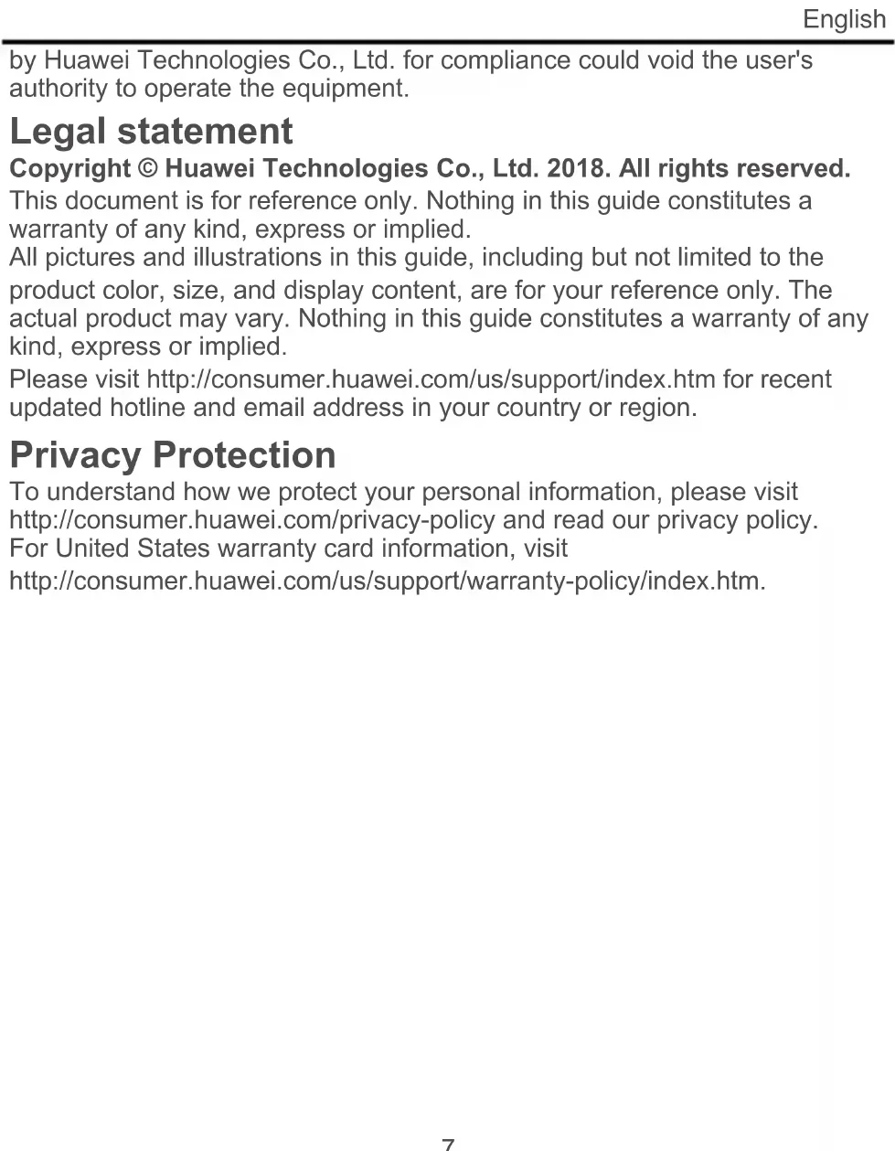 Този документ е само за справка. Нищо в ръководството не дава гаранции от какъвто и да било вид - преки или косвени. Всички снимки и илюстрации в настоящото ръководство, включително, но не само цветът и големината на продукта, и съдържанието на видимата информация, са само за ваше сведение. Реалният продукт може да се различава. Нищо в ръководството не дава гаранции от какъвто и да било вид - преки или косвени. Вижте http://consumer.huawei.com/us/support/index.htm за последна информация относно горещата линия за обслужване на клиенти и имейл адресите във вашата страна или регион. Защита на поверителността За да разберете как защитаваме личната ви информация, вижте http://consumer.huawei.com/privacy-policy и прочетете нашата политика за поверителност. За информация относно гаранционната карта в САЩ вижте http://consumer.huawei.com/us/support/warranty-policy/index.htm.Čeština