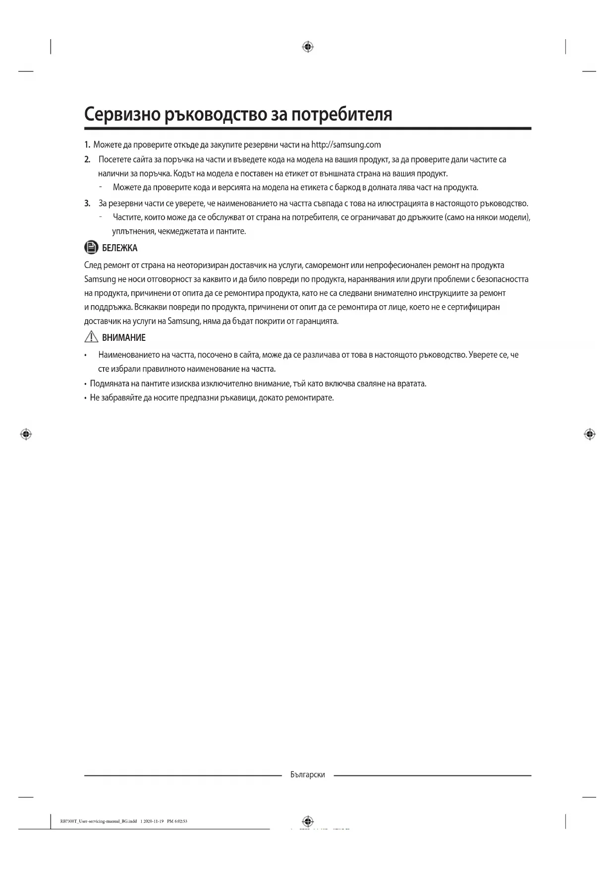 - Не забравяйте да носите предпазни ръкавици, докато ремонтирате. RB7300T_User-servicing-manual_BG.indd 1 2020-11-19 PM 6:02:53Български Действителното изображение и предоставените части на хладилника могат да се различават, в зависимост от модела и