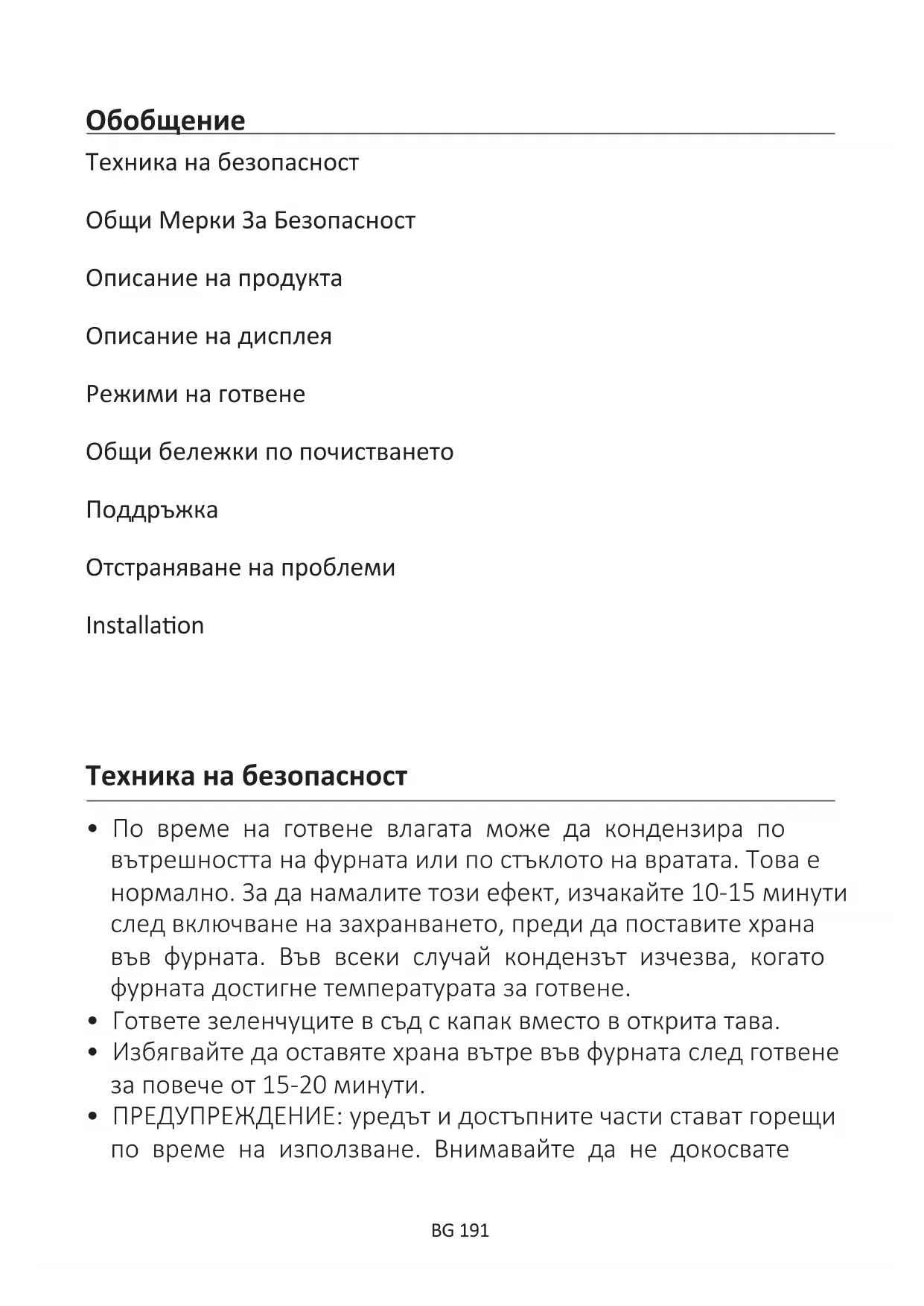 BG Производителя не носи отговорност за неточности и грешки възникнали при печата на тази инструкция. Производителя си запазва правото да внесе изменения в своите продукти, който смята за полезни, без това да е в ущърб на характеристиките свързани със сигурността или основните функции на уреда .HR 210 Sigurnosne upute Opće upute Opis proizvoda Opis zaslona Načini kuhanja Opće napomene o čišćenju Održavanje Rješavanje problema Installaon SažetakHR 211