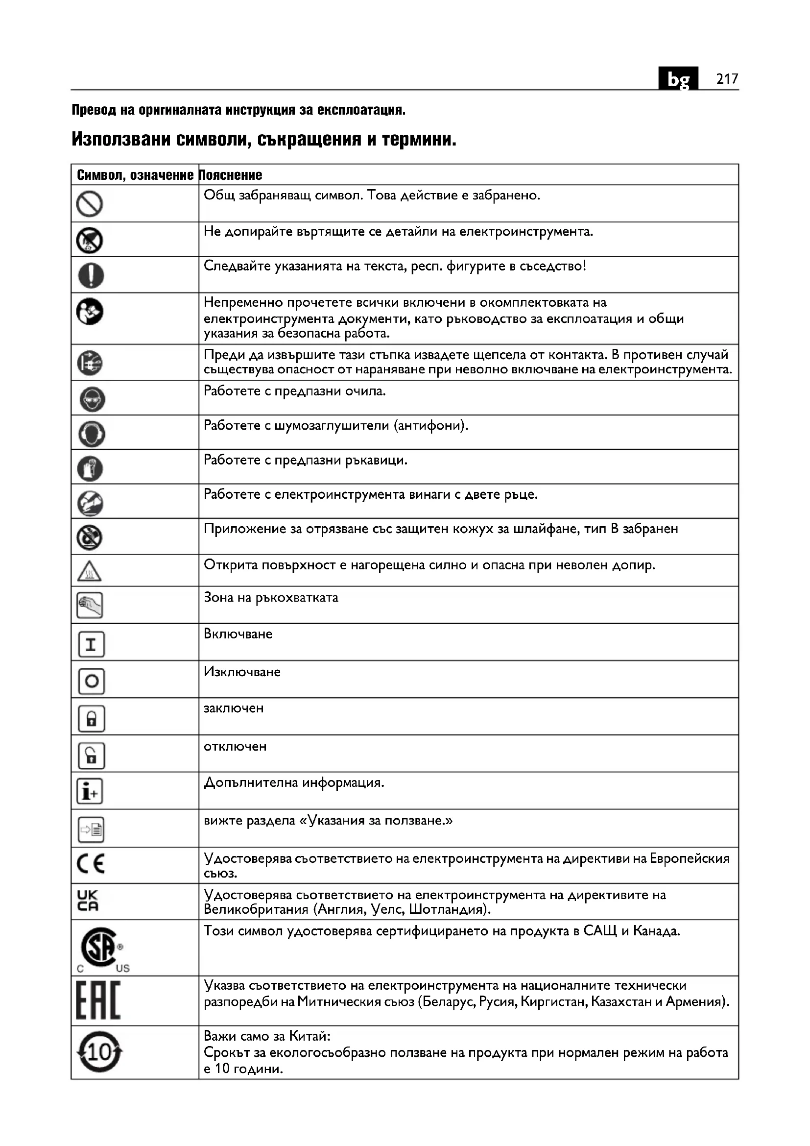 Удостоверява съответствието на електроинструмента на директивите на Великобритания (Англия, Уелс, Шотландия). Този символ удостоверява сертифицирането на продукта в САЩ и Канада. Указва съответствието на електроинструмента на националните технически разпоредби на Митническия съюз (Беларус, Русия, Киргистан, Казахстан и Армения). Важи само за Китай: Срокът за екологосъобразно ползване на продукта при нормален режим на работа е 10 години.218