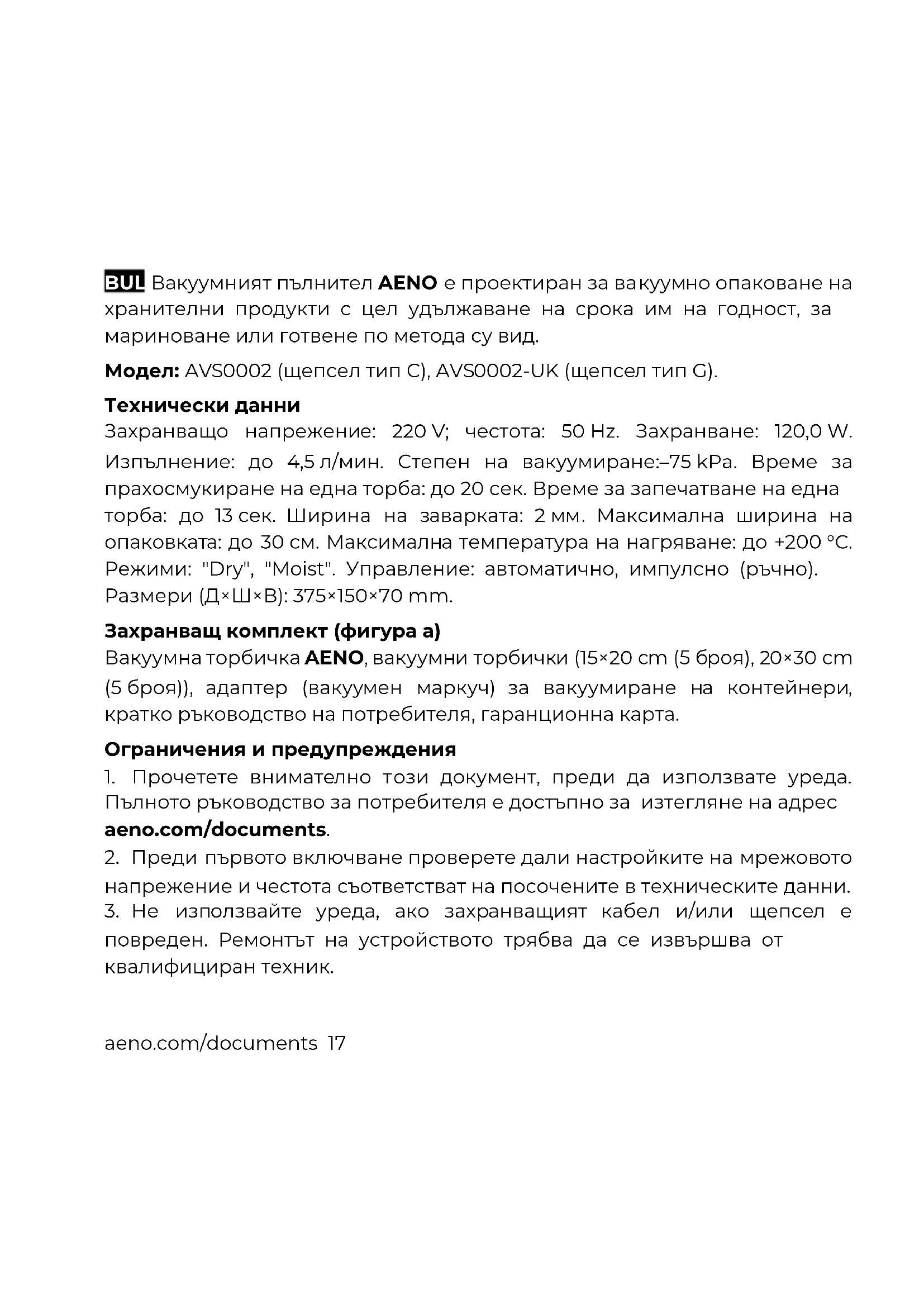 aeno.com/documents 17 BUL Вакуумният пълнител AENO е проектиран за вакуумно опаковане на хранителни продукти с цел удължаване на срока им на годност, за мариноване или готвене по метода су вид. Модел: AVS0002 (щепсел тип C), AVS0002-UK (щепсел тип G). Технически данни Захранващо напрежение: 220 V; честота: 50 Hz. Захранване: 120,0 W. Изпълнение: до 4,5 л/мин. Степен на вакуумиране:–75 kPa. Време за прахосмукиране на една торба: до 20 сек. Време за запечатване на една торба: до 13 сек. Ширина на заварката: 2 мм. Максимална ширина на опаковката: до 30 см. Максимална температура на нагряване: до +200 °C. Режими: "Dry", "Moist". Управление: автоматично, импулсно (ръчно). Размери (Д×Ш×В): 375×150×70 mm. Захранващ комплект (фигура а) Вакуумна торбичка AENO, вакуумни торбички (15×20 cm (5 броя), 20×30 cm (5 броя)), адаптер (вакуумен маркуч) за вакуумиране на контейнери, кратко ръководство на потребителя, гаранционна карта. Ограничения и предупреждения