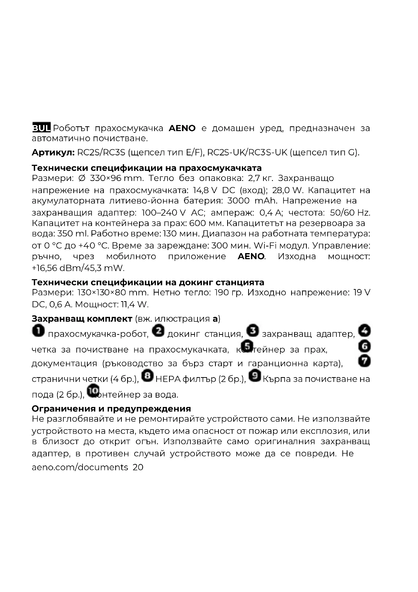aeno.com/documents 20 BUL Роботът прахосмукачка AENO е домашен уред, предназначен за автоматично почистване. Артикул: RC2S/RC3S (щепсел тип E/F), RC2S-UK/RC3S-UK (щепсел тип G). Технически спецификации на прахосмукачката Размери: Ø 330×96 mm. Тегло без опаковка: 2,7 кг. Захранващо напрежение на прахосмукачката: 14,8 V DC (вход); 28,0 W. Капацитет на акумулаторната литиево-йонна батерия: 3000 mAh. Напрежение на захранващия адаптер: 100–240 V AC; ампераж: 0,4 A; честота: 50/60 Hz. Капацитет на контейнера за прах: 600 мм. Капацитетът на резервоара за вода: 350 ml. Работно време: 130 мин. Диапазон на работната температура: от 0 °C до +40 °C. Време за зареждане: 300 мин. Wi-Fi модул. Управление: ръчно, чрез мобилното приложение AENO. Изходна мощност: +16,56 dBm/45,3 mW. Технически спецификации на докинг станцията Размери: 130×130×80 mm. Нетно тегло: 190 гр. Изходно напрежение: 19 V DC, 0,6 A. Мощност: 11,4 W. Захранващ комплект (вж. илюстрация а) прахосмукачка-робот, докинг станция, захранващ адаптер, четка за почистване на прахосмукачката, контейнер за прах, документация (ръководство за бърз старт и гаранционна карта), странични четки (4 бр.), HEPA филтър (2 бр.), Кърпа за почистване на пода (2 бр.), контейнер за вода. Ограничения и предупреждения Не разглобявайте и не ремонтирайте устройството сами. Не използвайте устройството на места, където има опасност от пожар или експлозия, или в близост до открит огън. Използвайте само оригиналния захранващ адаптер, в противен случай устройството може да се повреди. Не21 aeno.com/documents използвайте устройството на открито. Не допускайте проникване на вода в уреда и не го използвайте в помещения с висока влажност, например в бани. Не поставяйте уреда на места, където може лесно да падне (маси, столове, стълби, високи платформи и др.). Почистващото устройство има няколко сензора: лидар , разположен на повърхността на корпуса на почистващото устройство , и сензори на бронята . Не позволявайте на чужди предмети да падат върху сензорите. Когато почиствате, се грижете за безопасността на децата и възрастните хора, за да избегнете наранявания. Ако корпусът на прахосмукачката стане твърде горещ по време на зареждане, спрете зареждането. Не използвайте батерията на прахосмукачката с други устройства. Не свързвайте накъсо клемите на батерията и не я разглобявайте. Изключете захранването на уреда, ако той не работи дълго време. Прахосмукачката трябва да е включена и заредена по всяко време, за да работи по график. Зареждане преди започване на работа Преди да започнете работа, извадете щепселите от корпуса на прахосмукачката (вж. илюстрация б). Монтирайте страничните четки (вж. илюстрация в). Свържете докинг станцията към електрически контакт с помощта на захранващия адаптер (вж. фигура d). Включете захранващия адаптер в електрически контакт и поставете щепсела на захранващия адаптер в гнездото на корпуса на докинг станцията. Вземете прахосмукачката за корпуса и подравнете контактите й на дъното между страничните четки с контактите на докинг станцията . Ако прахосмукачката-робот е позиционирана правилно, светодиодът на докинг станцията и бутонътaeno.com/documents 22 за презареждане на робота ще мигат. След като зареждането приключи, бутонът за презареждане на робота винаги ще бъде включен. Първото зареждане от докинг станцията трябва да продължи 6,5 часа. ПРЕДУПРЕЖДЕНИЕ! Докинг станцията трябва да се монтира до стената (вж. илюстраци