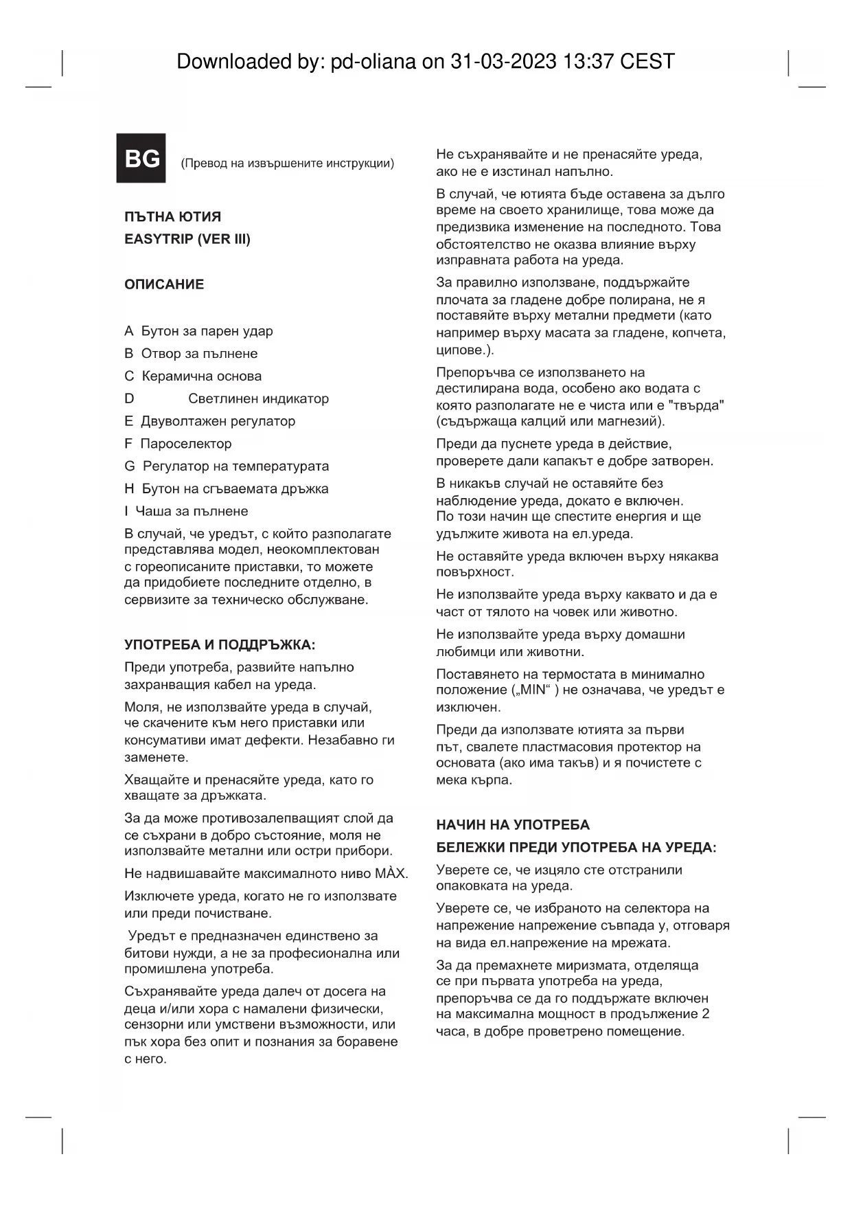 Преди да използвате ютията за първи път, свалете пластмасовия протектор на основата (ако има такъв) и я почистете с мека кърпа. НАЧИН НА УПОТРЕБА БЕЛЕЖКИ ПРЕДИ УПОТРЕБА НА УРЕДА: Уверете се, че изцяло сте отстранили опаковката на уреда. Увepeтe ce, че избраното на селектора на напрежение напрежение съвпада у, отговаря на вида ел.напрежение нa мpeжaтa. За да премахнете миризмата, отделяща се при първата употреба на уреда, препоръчва се да го поддържате включен на максимална мощност в продължение 2 часа, в добре проветрено помещение. BG (Превод на извършените инструкции) Downloaded by: pd-oliana on 31-03-2023 13:37 CESTПодгответе уреда в зависимост от функцията която желаете да използвате. Селектор на захранващо напрежение