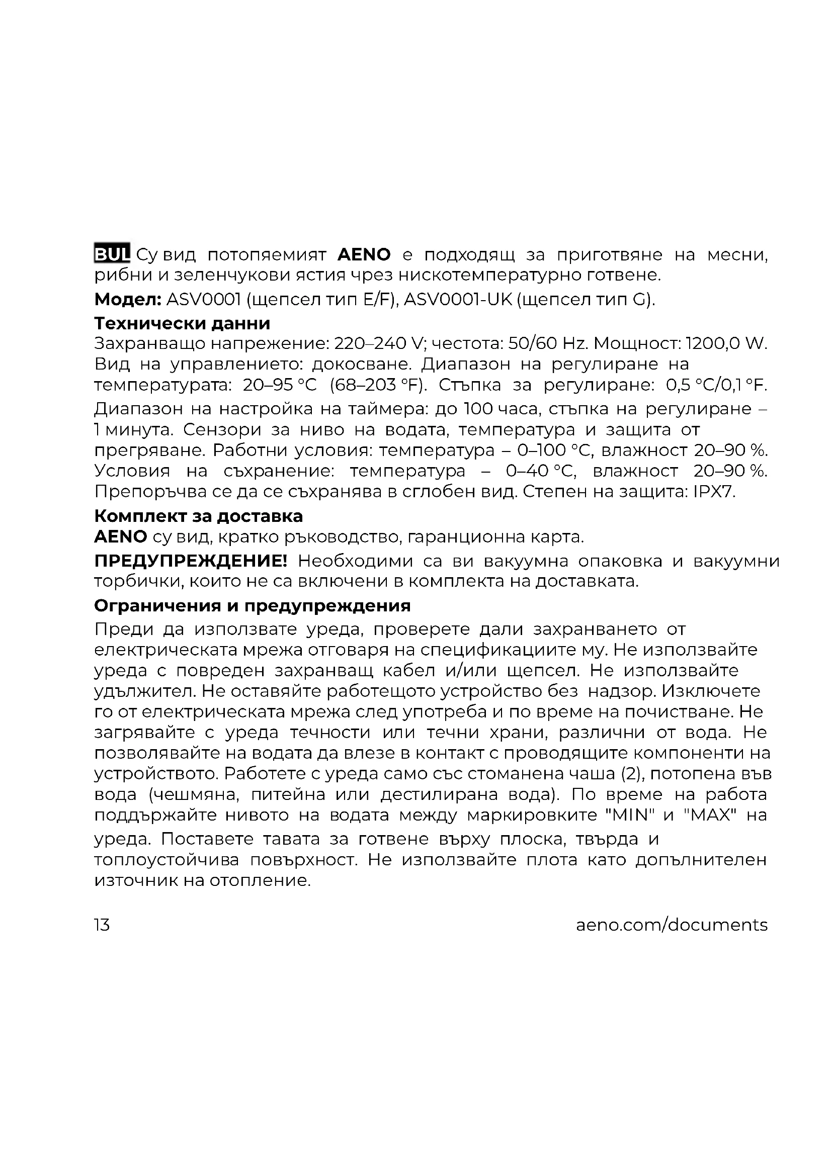 BUL Су вид потопяемият AENO е подходящ за приготвяне на месни, рибни и зеленчукови ястия чрез нискотемпературно готвене. Модел: ASV0001 (щепсел тип E/F), ASV0001-UK (щепсел тип G). Технически данни Захранващо напрежение: 220–240 V; честота: 50/60 Hz. Мощност: 1200,0 W. Вид на управлението: докосване. Диапазон на регулиране на температурата: 20–95 °С (68–203 °F). Стъпка за регулиране: 0,5 °С/0,1 °F. Диапазон на настройка на таймера: до 100 часа, стъпка на регулиране – 1 минута. Сензори за ниво на водата, температура и защита от прегряване. Работни условия: температура – 0–100 °C, влажност 20–90 %. Условия на съхранение: температура – 0–40 °C, влажност 20–90 %. Препоръчва се да се съхранява в сглобен вид. Степен на защита: IPX7. Комплект за доставка AENO су вид, кратко ръководство, гаранционна карта. ПРЕДУПРЕЖДЕНИЕ! Необходими са ви вакуумна опаковка и вакуумни торбички, които не са включени в комплекта на доставката. Ограничения и предупреждения Преди да използвате уреда, проверете дали захранването от електрическата мрежа отговаря на спецификациите му. Не използвайте уреда с повреден захранващ кабел и/или щепсел. Не използвайте удължител. Не оставяйте работещото устройство без надзор. Изключете го от електрическата мрежа след употреба и по време на почистване. Не загрявайте с уреда течности или течни храни, различни от вода. Не позволявайте на водата да влезе в контакт с проводящите компоненти на устройството. Работете с уреда само със стоманена чаша (2), потопена във вода (чешмяна, питейна или дестилирана вода). По време на работа поддържайте нивото на водата между маркировките "MIN" и "MAX" на уреда. Поставете тавата за готвене върху плоска, твърда и топлоустойчива повърхност. Не използвайте плота като допълнителен източник на отопление.aeno.com/documents