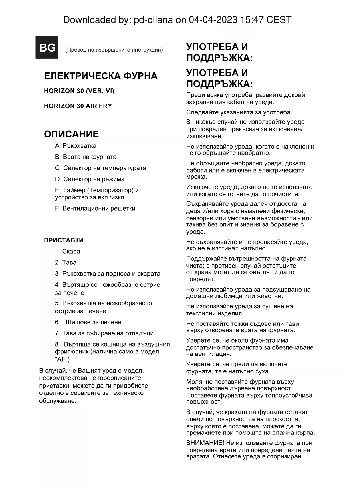 Не използвайте уреда за подсушаване на домашни любимци или животни. Не използвайте уреда за сушене на текстилни изделия. Не поставяйте тежки съдове или тави върху отворената врата на фурнатa. Уверете се, че около фурната има достатъчно пространство за обезпечаване на вентилация. Уверете се, че преди да включите фурната, тя е напълно суха. Моля, не поставяйте фурната върху необработена дървена повърхност. Поставете фурната върху топлоустойчива повърхност. В случай, че краката на фурната оставят следи по повърхността на плоскостта, върху която е поставена, можете да ги премахнете при помощта на влажна кърпа. ВНИМАНИЕ! Не използвайте фурната при повредена врата или повредени панти на вратата. Отнесете уреда в оторизиран BG (Превод на извършените инструкции) Downloaded by: pd-oliana on 04-04-2023 15:47 CESTсервиз за техническо обслужване. ВНИМАНИЕ! Не използвайте уреда при напукано или счупено стъкло. Поставянето на регулатора на термостата в минимално положение („MIN)“ не означава, че уредът е окончателно