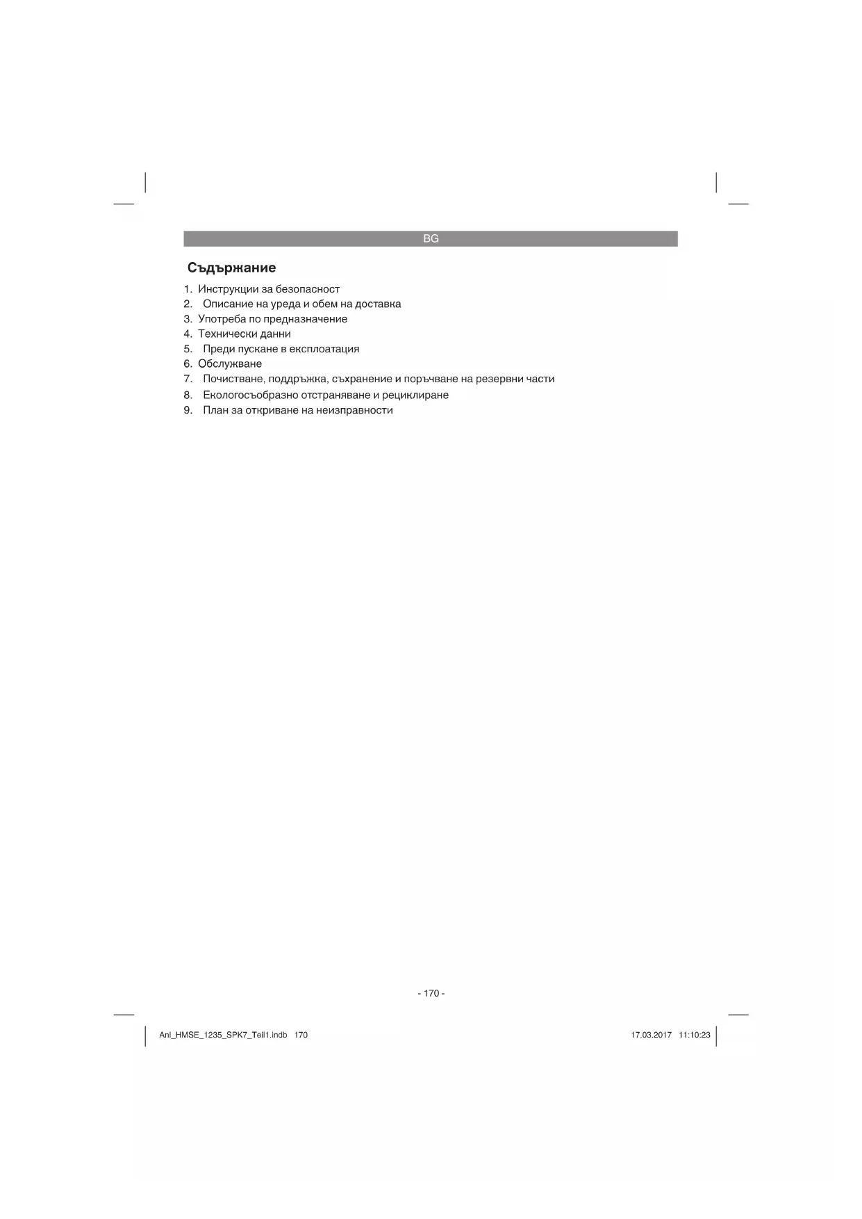 отстраняване и рециклиране Уредът е опакован с цел предотвратяване на повреди при транспортирането. Опаковка е суровина и може да се използва отново или да се преработи. Уредът и принадлежностите му се състоят от различни материали, например метал и пластмаса. Не изхвърляйте повредените уреди заедно с битовите отпадъци. Трябва да предадете уреда в подходящ приемен пункт, където уредът ще бъде унищожен съобразно изискванията. Ако не знаете къде има приемен пункт, можете да получите информация в общината. Anl_HMSE_1235_SPK7_Teil1.indb 181Anl_HMSE_1235_SPK7_Teil1.indb 181 17.03.2017 11:10:2417.03.2017 11:10:24BG