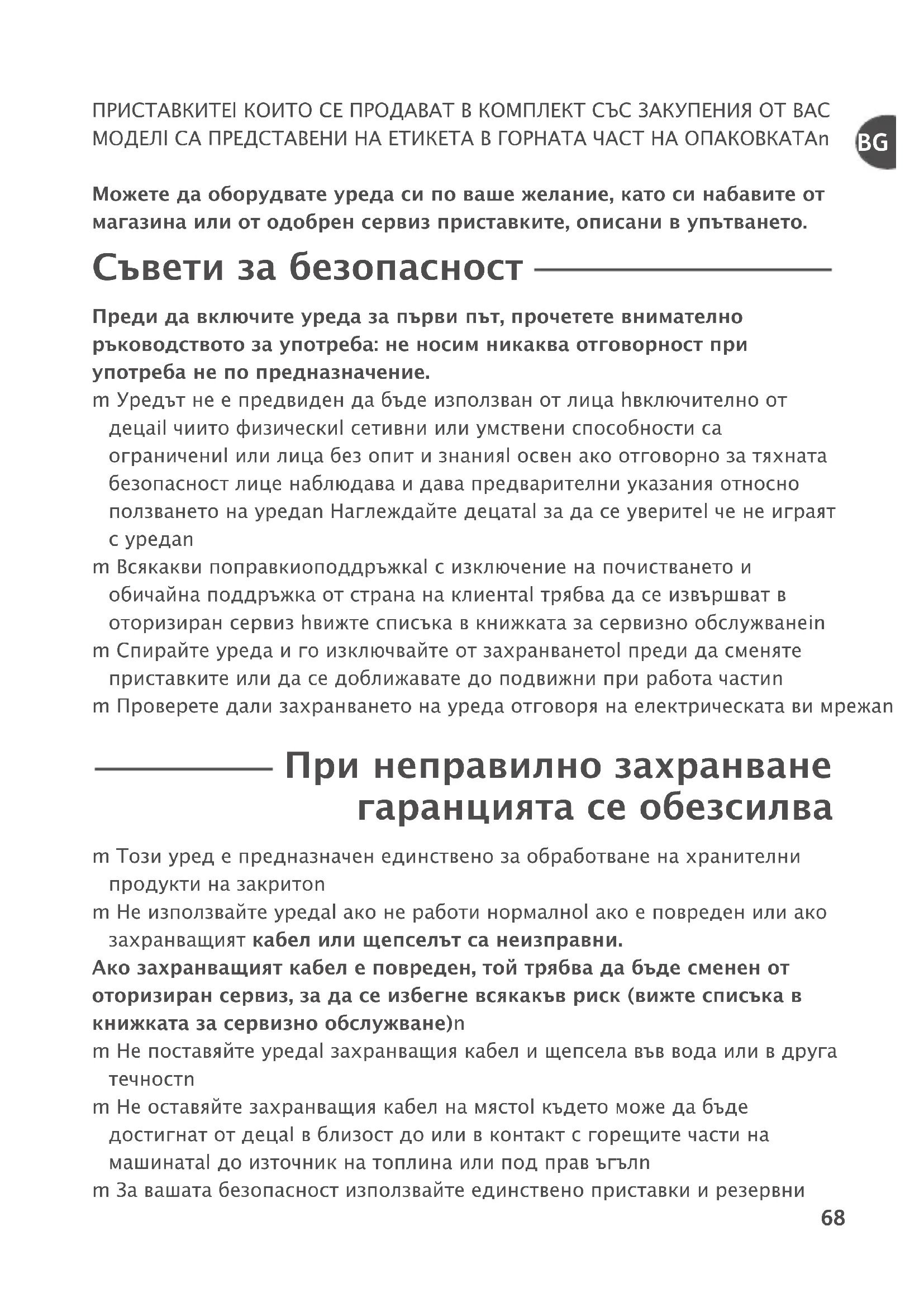 ПРИСТАВКИТЕ, КОИТО СЕ ПРОДАВАТ В КОМПЛЕКТ СЪС ЗАКУПЕНИЯ ОТ ВАС МОДЕЛ, СА ПРЕДСТАВЕНИ НА ЕТИКЕТА В ГОРНАТА ЧАСТ НА ОПАКОВКАТА. Можете да оборудвате уреда си по ваше желание, като си набавите от магазина или от одобрен сервиз приставките, описани в упътването. Съвети за безопасност Преди да включите уреда за първи път, прочетете внимателно ръководството за употреба: не носим никаква отговорност при употреба не по предназначение. - Уредът не е предвиден да бъде използван от лица (включително от деца), чиито физически, сетивни или умствени способности са ограничени, или лица без опит и знания, освен ако отговорно за тяхната безопасност лице наблюдава и дава предварителни указания относно ползването на уреда. Наглеждайте децата, за да се уверите, че не играят