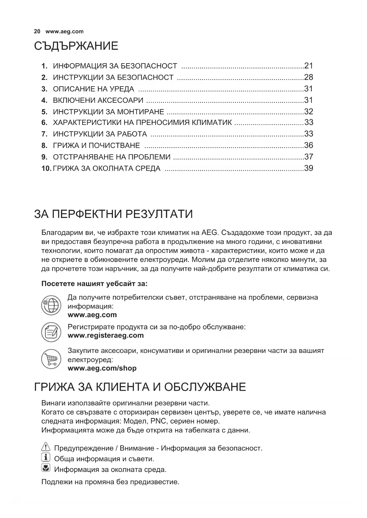 ENVIRONMENTAL CONCERNS Recycle the materials with the symbol. Put the packaging in applicable containers to recycle it. Help protect the environment and human health and to recycle waste of electrical and electronic appliances. Do not dispose appliances marked with the symbol with the household waste. Return the product to your local recycling facility or contact your municipaloffice. The software in the unit is partly based on free and open source software. To see the full copyright information and applicable license terms, please visit: https://emtech.delta.electrolux.com/license For more information visit www.electrolux.com20 www.aeg.com Подлежи на промяна без предизвестие. ЗА ПЕРФЕКТНИ РЕЗУЛТАТИ ГРИЖА ЗА КЛИЕНТА И ОБСЛУЖВАНЕ Благодарим ви, че избрахте този климатик на AEG. Създадохме този продукт, за да ви предоставя безупречна работа в продължение на много години, с иновативни технологии, които помагат да опростим живота - характеристики, които може и да не откриете в обикновените електроуреди. Молим да отделите няколко минути, за да прочетете този наръчник, за да получите най-добрите резултати от климатика си. Винаги използвайте оригинални резервни части. Когато се свързвате с оторизиран сервизен център, уверете се, че имате налична следната информация: Модел, PNC, сериен номер. Информацията може да бъде открита на табелката с данни. Посетете нашият уебсайт за: Да получите потребителски съвет, отстраняване на проблеми, сервизна информация: www.aeg.com Регистрирате продукта си за по-добро обслужване: www.regieraeg.com Закупите аксесоари, консумативи и оригинални резервни части за вашият електроуред: www.aeg.com/shop
