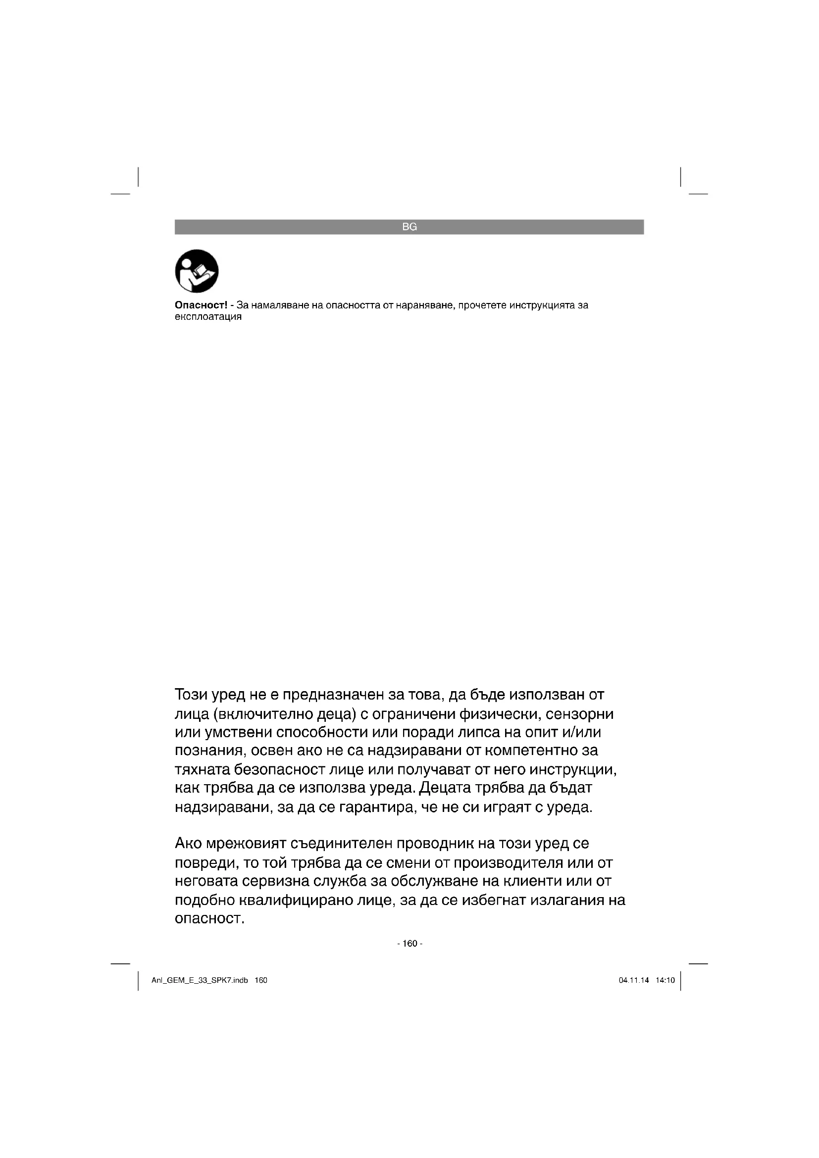Опасност! - За намаляване на опасността от нараняване, прочетете инструкцията за експлоатация Този уред не е предназначен за това, да бъде използван от лица (включително деца) с ограничени физически, сензорни или умствени способности или поради липса на опит и/или познания, освен ако не са надзиравани от компетентно за тяхната безопасност лице или получават от него инструкции, как трябва да се използва уреда. Децата трябва да бъдат надзиравани, за да се гарантира, че не си играят с уреда. Ако мрежовият съединителен проводник на този уред се повреди, то той трябва да се смени от производителя или от неговата сервизна служба за обслужване на клиенти или от подобно квалифицирано лице, за да се избегнат излагания на
