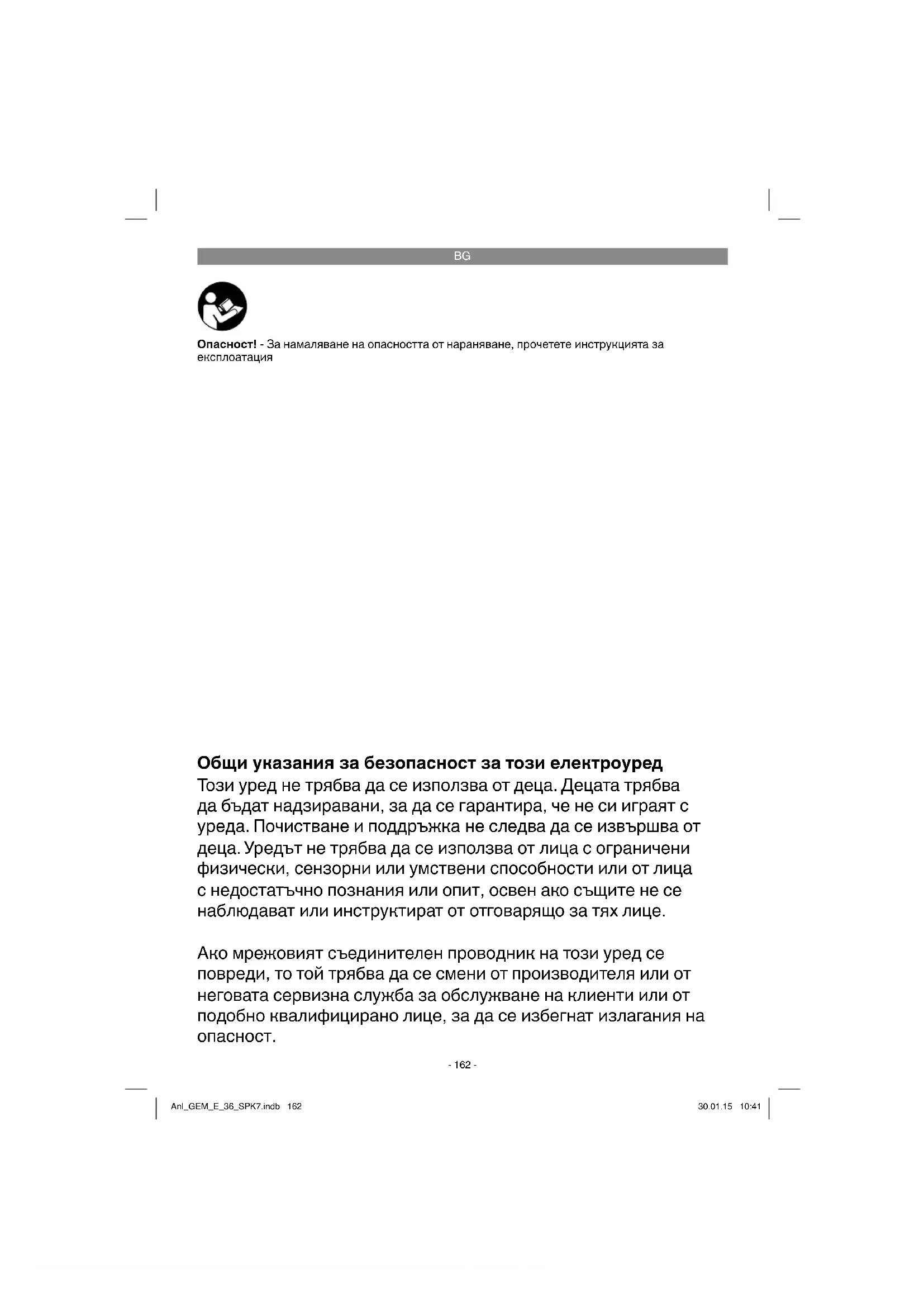 Опасност! - За намаляване на опасността от нараняване, прочетете инструкцията за експлоатация Общи указания за безопасност за този електроуред Този уред не трябва да се използва от деца. Децата трябва да бъдат надзиравани, за да се гарантира, че не си играят с уреда. Почистване и поддръжка не следва да се извършва от деца. Уредът не трябва да се използва от лица с ограничени физически, сензорни или умствени способности или от лица с недостатъчно познания или опит, освен ако същите не се наблюдават или инструктират от отговарящо за тях лице. Ако мрежовият съединителен проводник на този уред се повреди, то той трябва да се смени от производителя или от неговата сервизна служба за обслужване на клиенти или от подобно квалифицирано лице, за да се избегнат излагания на