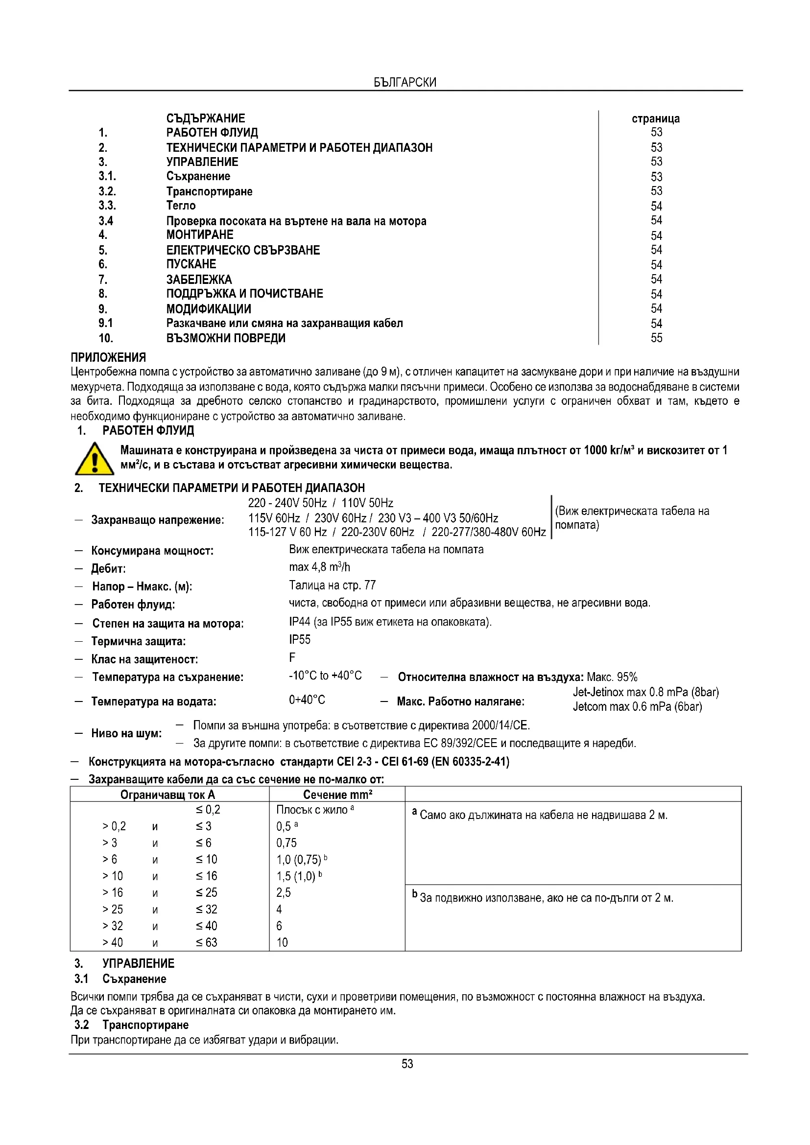 Помпи за външна употреба: в съответствие с директива 2000/14/CE. − За другите помпи: в съответствие с директива EC 89/392/CEE и последващите я наредби. − Конструкцията на мотора-съгласно стандарти CEI 2-3 - CEI 61-69 (EN 60335-2-41) − Захранващите кабели да са със сечение не по-малко от: Ограничавщ ток A Сечение mm²