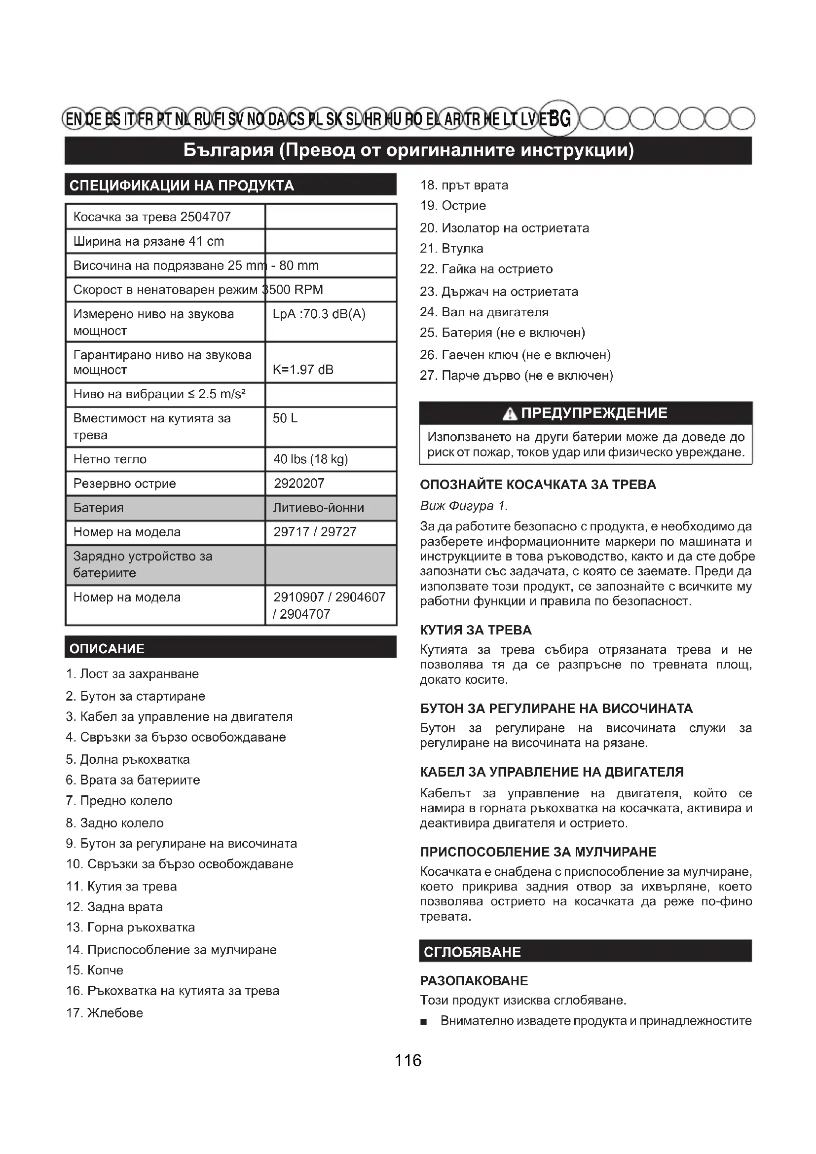 EN DE ES IT FR PT NL RU FI SV NO DA CS PL SK SL HR HU RO EL AR TR HE LT LV ET СПЕЦИФИКАЦИИ НА ПРОДУКТАКосачка за трева 2504707 Ширина на рязане 41 cmВисочина на подрязване 25 mm - 80 mmСкорост в ненатоварен режим 3500 RPMИзмерено ниво на звукова мощностLpA :70.3 dB(A)Гарантирано ниво на звукова мощностLwA :90.3 dB(A), K=1.97 dBНиво на вибрации ≤ 2.5 m/s²Вместимост на кутията за трева 50 L Нетно тегло 40 lbs (18 kg)Резервно острие 2920207Батерия Литиево-йонниНомер на модела 29717 / 29727 Зарядно устройство за батериитеНомер на модела 2910907 / 2904607 / 2904707ОПИСАНИЕ1. Лост за захранване 2. Бутон за стартиране3. Кабел за управление на двигателя4. Свръзки за бързо освобождаване 5. Долна ръкохватка6. Врата за батериите7. Предно колело8. Задно колело 9. Бутон за регулиране на височината10. Свръзки за бързо освобождаване11. Кутия за трева12. Задна врата13. Горна ръкохватка14. Приспособление за мулчиране15. Копче16. Ръкохватка на кутията за трева17. Жлебове 18. прът врата19. Острие20. Изолатор на остриетата 21. Втулка22. Гайка на острието 23. Държач на остриетата24. Вал на двигателя25. Батерия (не е включен)26. Гаечен ключ (не е включен)27. Парче дърво (не е включен) ПРЕДУПРЕЖДЕНИЕ Използването на други батерии може да доведе до риск от пожар, токов удар или физическо увреждане. ОПОЗНАЙТЕ КОСАЧКАТА ЗА ТРЕВАВиж Фигура 1. За да работите безопасно с продукта, е необходимо да разберете информационните маркери по машината и инструкциите в това ръководство, както и да сте добре запознати със задачата, с която се заемате. Преди да използвате този продукт, се запознайте с всичките му работни функции и правила по безопасност.КУТИЯ ЗА ТРЕВА Кутията за трева събира отрязаната трева и не позволява тя да се разпръсне по тревната площ, докато косите. БУТОН ЗА РЕГУЛИРАНЕ НА ВИСОЧИНАТА Бутон за регулиране на височината служи за регулиране на височината на рязане.КАБЕЛ ЗА УПРАВЛЕНИЕ НА ДВИГАТЕЛЯ Кабелът за управление на двигателя, който се намира в горната ръкохватка на косачката, активира и деактивира двигателя и острието.ПРИСПОСОБЛЕНИЕ ЗА МУЛЧИРАНЕ Косачката е снабдена с приспособление за мулчиране, което прикрива задния отвор за ихвърляне, което позволява острието на косачката да реже по-фино тревата.СГЛОБЯВАНЕРАЗОПАКОВАНЕТози продукт изисква сглобяване. ■ Внимателно извадете продукта и принадлежностите 116България (Превод от оригиналните инструкции)