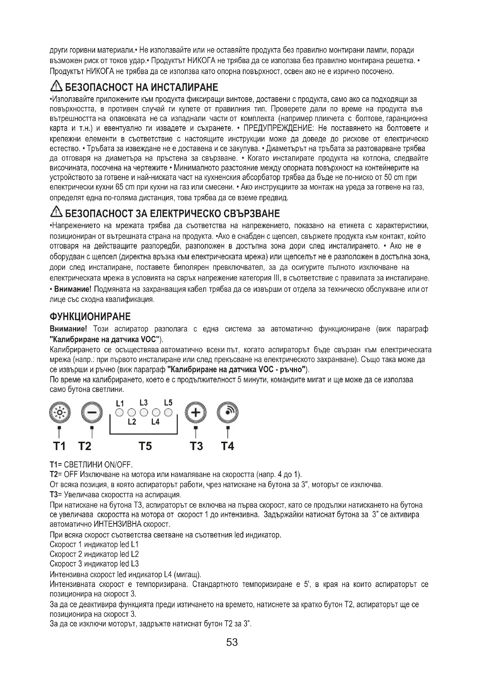 T1= СВЕТЛИНИ ON/OFF. T2= OFF Изключване на мотора или намаляване на скоростта (напр. 4 до 1). От всяка позиция, в която аспираторът работи, чрез натискане на бутона за 3", моторът се изключва. T3= Увеличава скоростта на аспирация. При натискане на бутона T3, аспираторът се включва на първа скорост, като се продължи натискането на бутона се увеличава скоростта на мотора от скорост 1 до интензивна. Задържайки натиснат бутона за 3” се активира автоматично ИНТЕНЗИВНА скорост. При всяка скорост съответства светване на съответния led индикатор. Скорост 1 индикатор led L1 Скорост 2 индикатор led L2 Скорост 3 индикатор led L3 Интензивна скорост led индикатор L4 (мигащ). Интензивната скорост е темпоризирана. Стандартното темпоризиране е 5', в края на които аспираторът се позиционира на скорост 3. За да се деактивира функцията преди изтичането на времето, натиснете за кратко бутон T2, аспираторът ще се позиционира на скорост 3. За да се изключи моторът, задръжте натиснат бутон T2 за 3”. 53T4= Датчик ON/OFF. Активира или деактивира функцията на датчика VOC. При натискане на бутона функцията VOC се активира и led индикаторът L5 става син. Когато функцията на датчика VOC е активирана, моторът трябва да бъде изключен (ако предходния статус е бил включен). Аспираторът ще светне на най-подходящата скорост, въз основа на изпарения от готвене, открити от датчика, с който е оборудван аспиратора. T5= Индикатор на статус на функциониране Калибриране на датчика VOC Калибрирането на датчика продължава около 5 минути, като се натисне бутон T4, аспираторът светва на първа скорост (фиксиран led индикатор L5), докато led индикаторите L1 L2 L3 L4 започват да мигат циклично. Калибрирането е завършено, когато led индикаторите L1 L2 L3 L4 се изключат, последвани от звуков сигнал (бип). По време на калибрирането е възможно да се включат или изключат само светлините. Калибрирането е необходимо, за да позволи на датчика, с който е оборудван аспираторът, да работи правилно и може да бъде: автоматично: всеки път, когато аспираторът бъде свързан към електрическата мрежа (напр.: при първото инсталиране или след прекъсване на електрическото захранване). ръчно: да се извърши, когато се забележи незадоволително функциониране на автоматичното функциониране и да се извърши, когато в кухнята продължават да съществуват нормални условия на околната среда. Ръчното калибриране се активира чрез натискане и задържане за 6" на бутона T4. Избор на плота за готвене За да използвате по най-добрия начин функцията VOC, е необходимо да изберете правилния тип плот за готвене (газ - индукционен или електрически). Когато аспираторът и датчикът VOC са изключени, натиснете едновременно бутоните T1 и T4, докато чуете звуков сигнал (бип), отпуснете бутоните и с последващите натискания или на бутон T1 или T4, можете да изберете желания плот за готвене по следната схема: Led 1: газов плот за готвене Led 2: електрически плот за готвене Led 3: индукционен плот за готвене избраният бутон остава включен, за да покаже, че изборът е бил направен, след 10 секунди бутонът мига за кратко, за да покаже, че направеният избор е записан. Сигнализация на филтър за мазнини След 40 часа функциониране, индикаторът led L1 и L5 започват да мигат. Когато се появи тази сигнализация, инсталираният филтър за мазнини трябва да се измие. За да занулите сигнализацията, задръжте натиснат бутон T2 за 3”. Сигнализация на