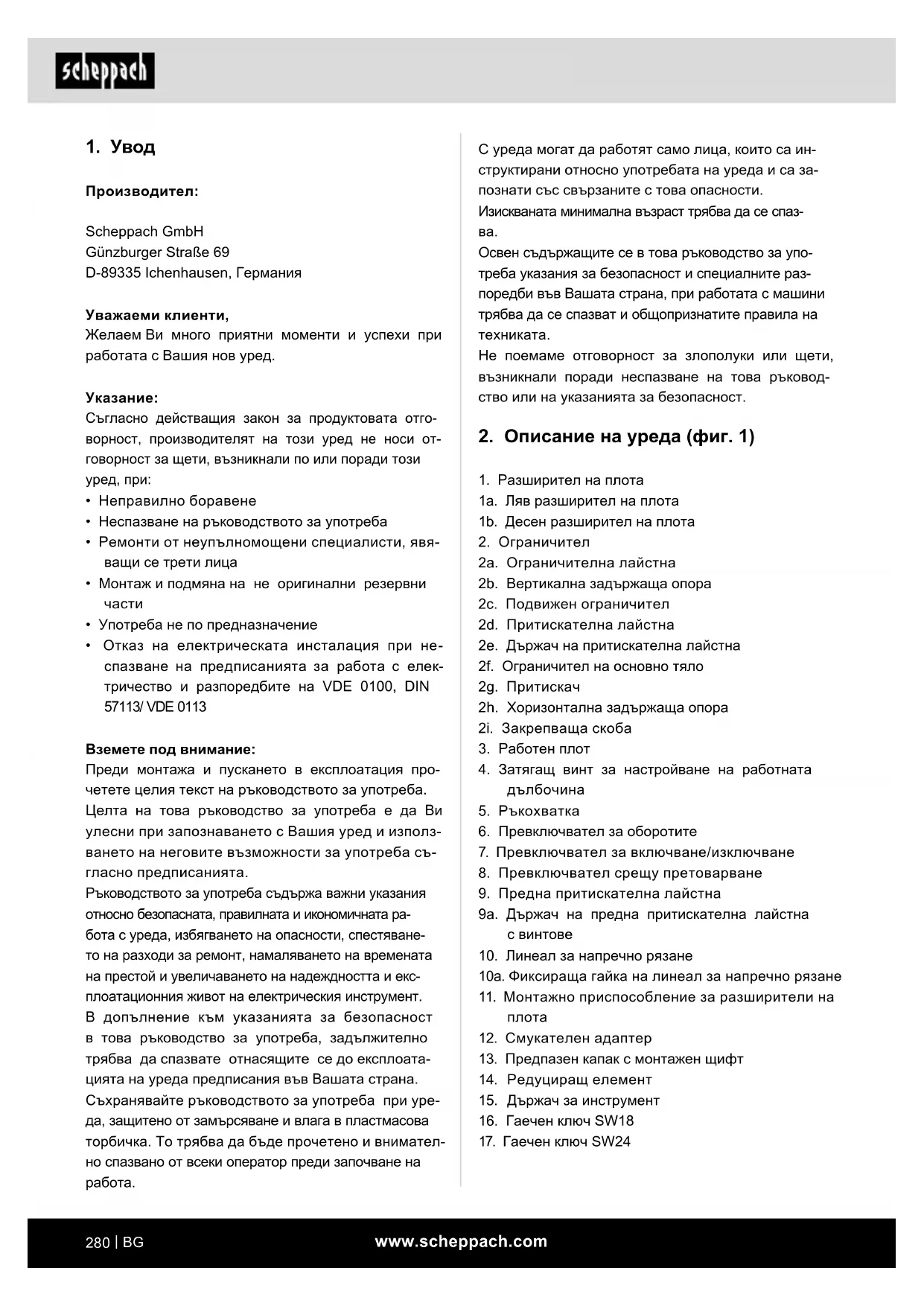 – Не използвайте дефектни или повредени свързващи проводници. – Не използвайте електрически инструменти, чийто превключвател не може да се включва или изключва. 21 ВНИМАНИЕ! – Използването на други работни инструмен- ти и принадлежности може да представлява опасност от нараняване за Вас. 22 Възлагайте ремонта на Вашия електрически инструмент на електротехник – Този електрически инструмент отговаря на приложимите норми за безопасност. Ре- монти могат да се извършват само от елек- тротехник при използване на оригинални резервни части; в противен случай могат да възникнат злополуки за потребителя.www.scheppach.com