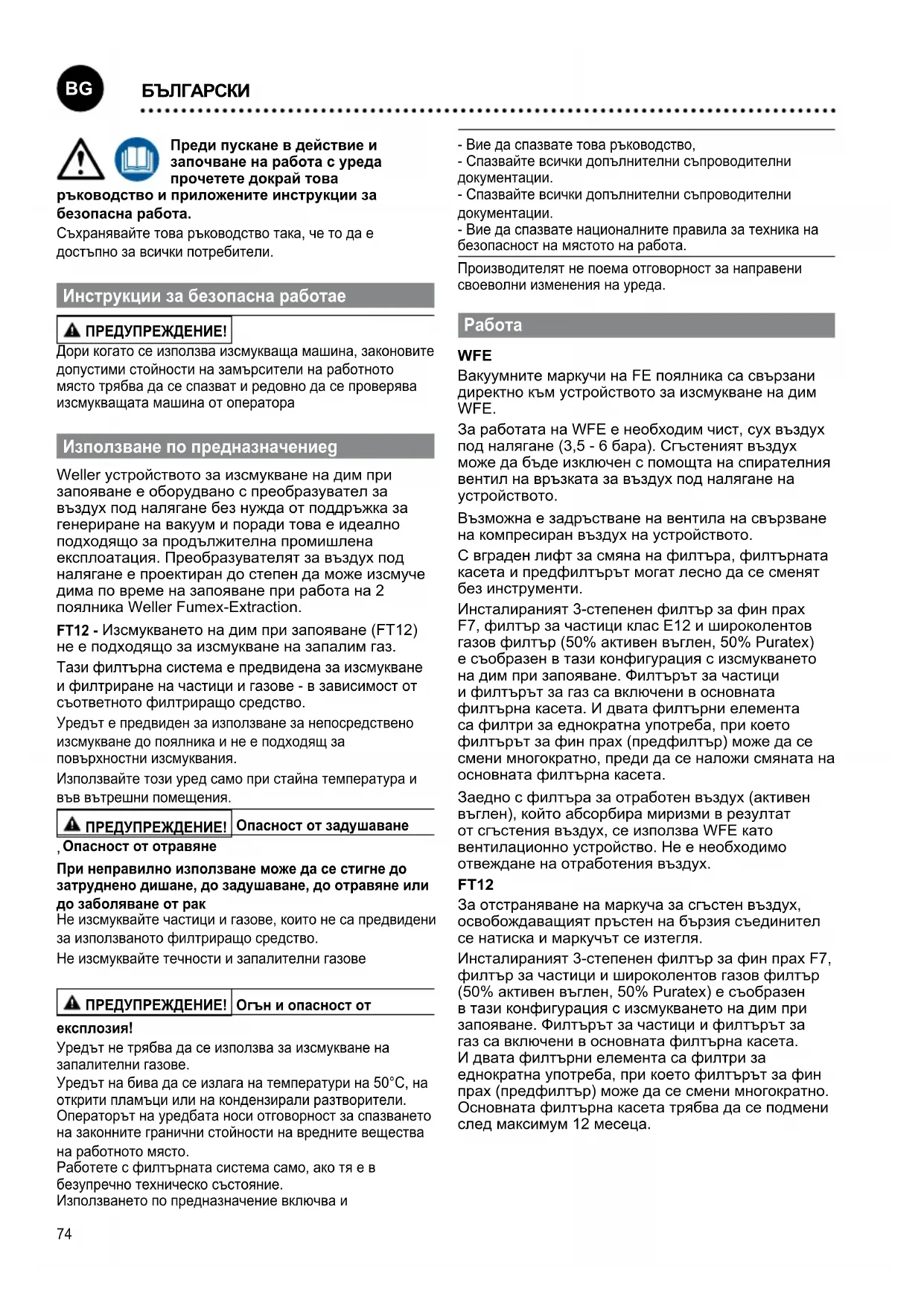 БЪЛГАРСКИ75 FT12 се използва като вентилационно устройство заедно с филтъра за отработен въздух (активен въглен), който абсорбира миризмите в резултат от сгъстения въздух. Не е необходимо отвеждане на отработения въздух. WARNUNG Дори когато се използва изсмукваща машина, законовите допустими стойности на замърсители на работното място трябва да се спазват и редовно да се проверява изсмукващата машина от оператора. Обслужване и поддържане ПРЕДУПРЕЖДЕНИЕ! Преди работи по поддръжката устройството трябва да се разхерметизира. За да се осигури правилна работа на уреда, вакуумната тръба и изсмукващия маркуч на поялника FE трябва редовно да се почистват. При силно замърсяване изсмукващата тръба може да се сложи в херметично затворен съд в алкохол за почистване (спирт) и да постои, докато се разтворят остатъците от флюса. ПРЕДУПРЕЖДЕНИЕ! При използване на средства за почистване спазвайте узаконените Правила за техника на безопасност при работа с тях. Средството за почистване трябва да се отстранява като специален отпадък. Ако мощността на изсмукване вече не е достатъчна при почистени FE поялници, трябва да се проверят