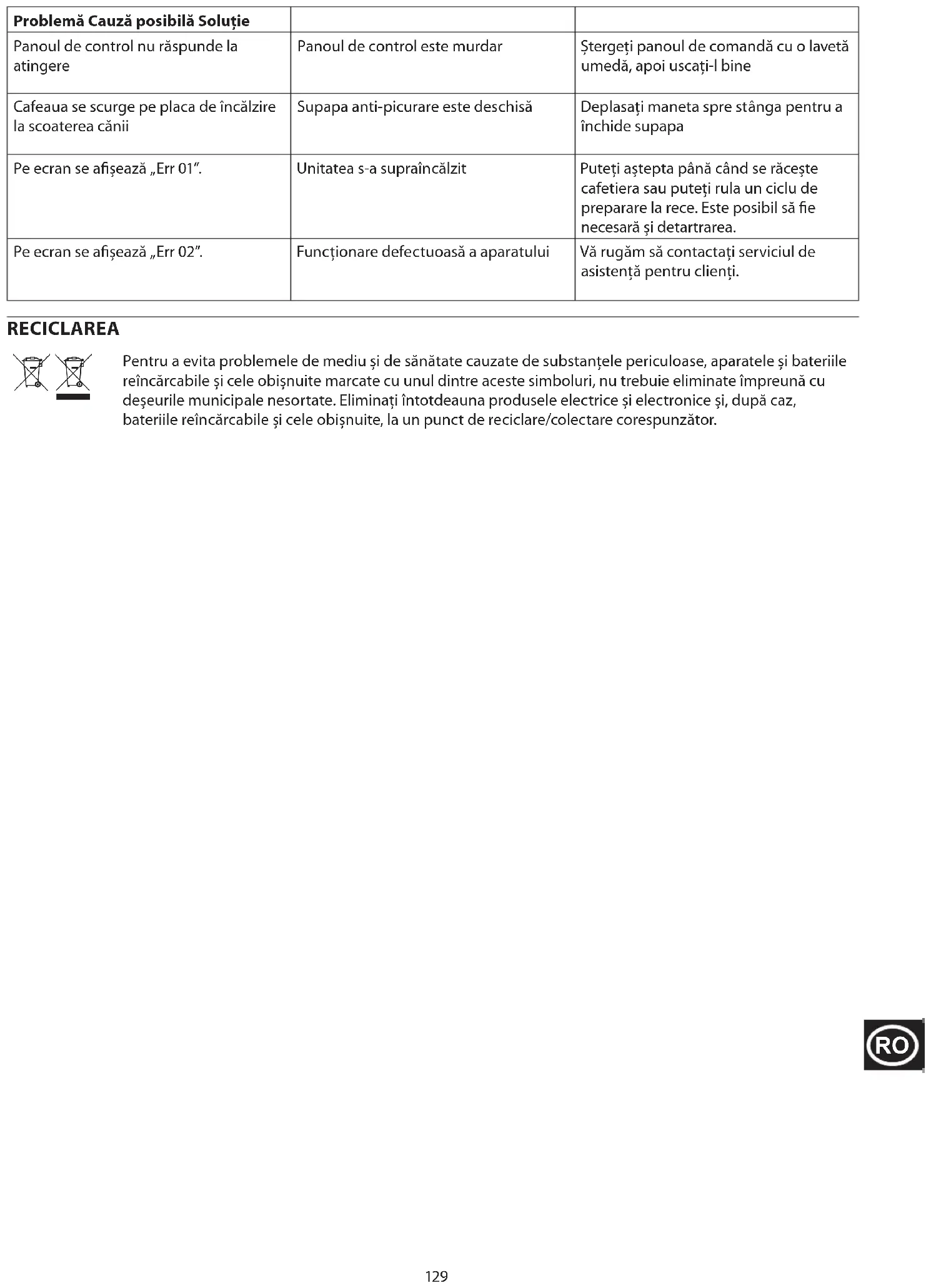 ОТСТРАНЯВАНЕ НА НЕИЗПРАВНОСТИ Проблем Възможна причина Решение Не се прави кафе Контейнерът за вода е празен Напълнете контейнера за вода Лостът срещу прокапване е в затворена позиция Преместете лоста против прокапване