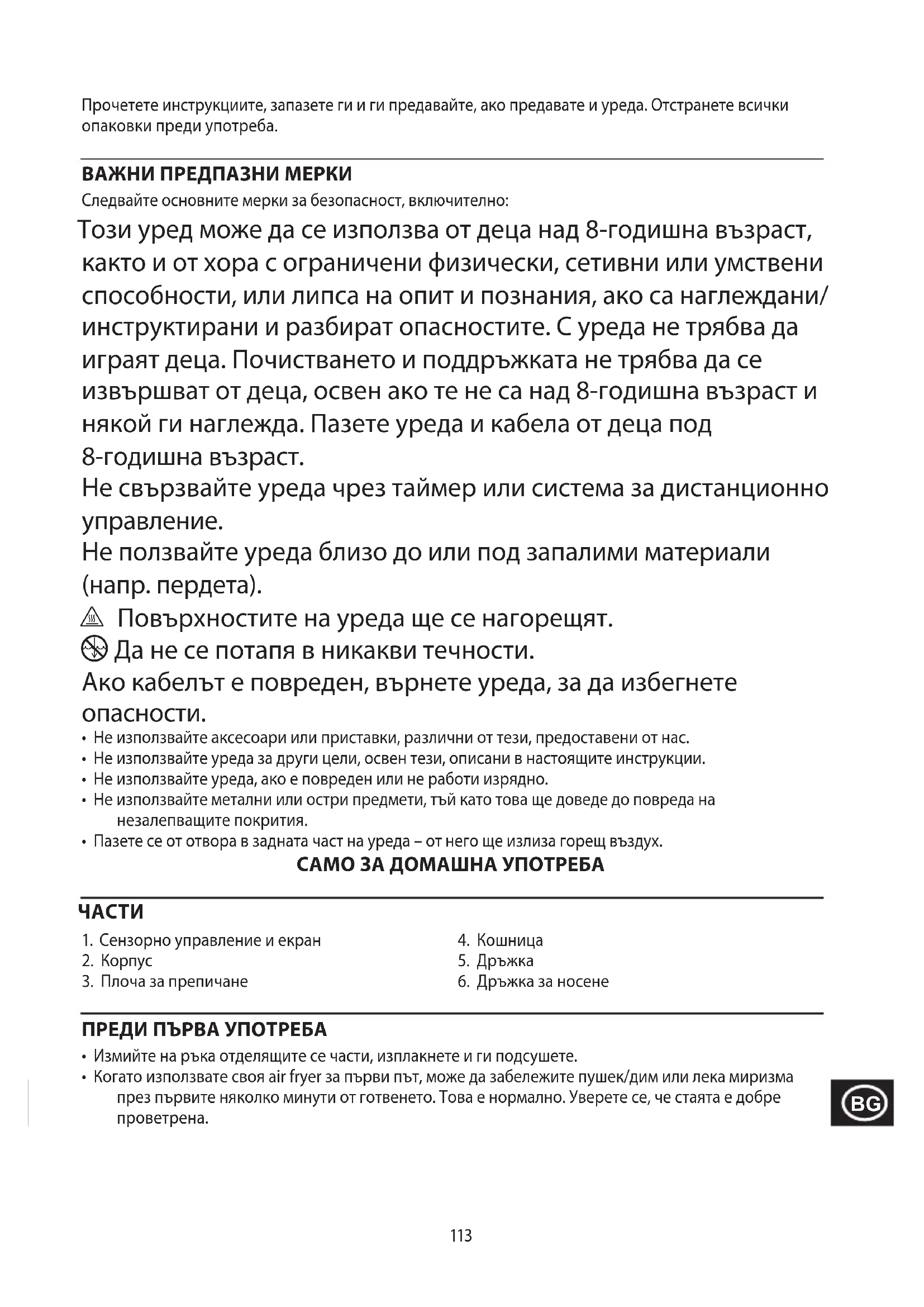 Pentru a evita problemele de mediu și de sănătate cauzate de substanțele periculoase, aparatele și bateriile reîncărcabile și cele obișnuite marcate cu unul dintre aceste simboluri, nu trebuie eliminate împreună cu deșeurile municipale nesortate. Eliminați întotdeauna produsele electrice și electronice și, după caz, bateriile reîncărcabile și cele obișnuite, la un punct de reciclare/colectare corespunzător.113 Прочетете инструкциите, запазете ги и ги предавайте, ако предавате и уреда. Отстранете всички опаковки преди употреба. ВАЖНИ ПРЕДПАЗНИ МЕРКИ Следвайте основните мерки за безопасност, включително: Този уред може да се използва от деца над 8-годишна възраст, както и от хора с ограничени физически, сетивни или умствени способности, или липса на опит и познания, ако са наглеждани/ инструктирани и разбират опасностите. С уреда не трябва да играят деца. Почистването и поддръжката не трябва да се извършват от деца, освен ако те не са над 8-годишна възраст и някой ги наглежда. Пазете уреда и кабела от деца под 8-годишна възраст. Не свързвайте уреда чрез таймер или система за дистанционно управление. Не ползвайте уреда близо до или под запалими материали (напр. пердета). ¬ Повърхностите на уреда ще се нагорещят. i Да не се потапя в никакви течности. Ако кабелът е повреден, върнете уреда, за да избегнете