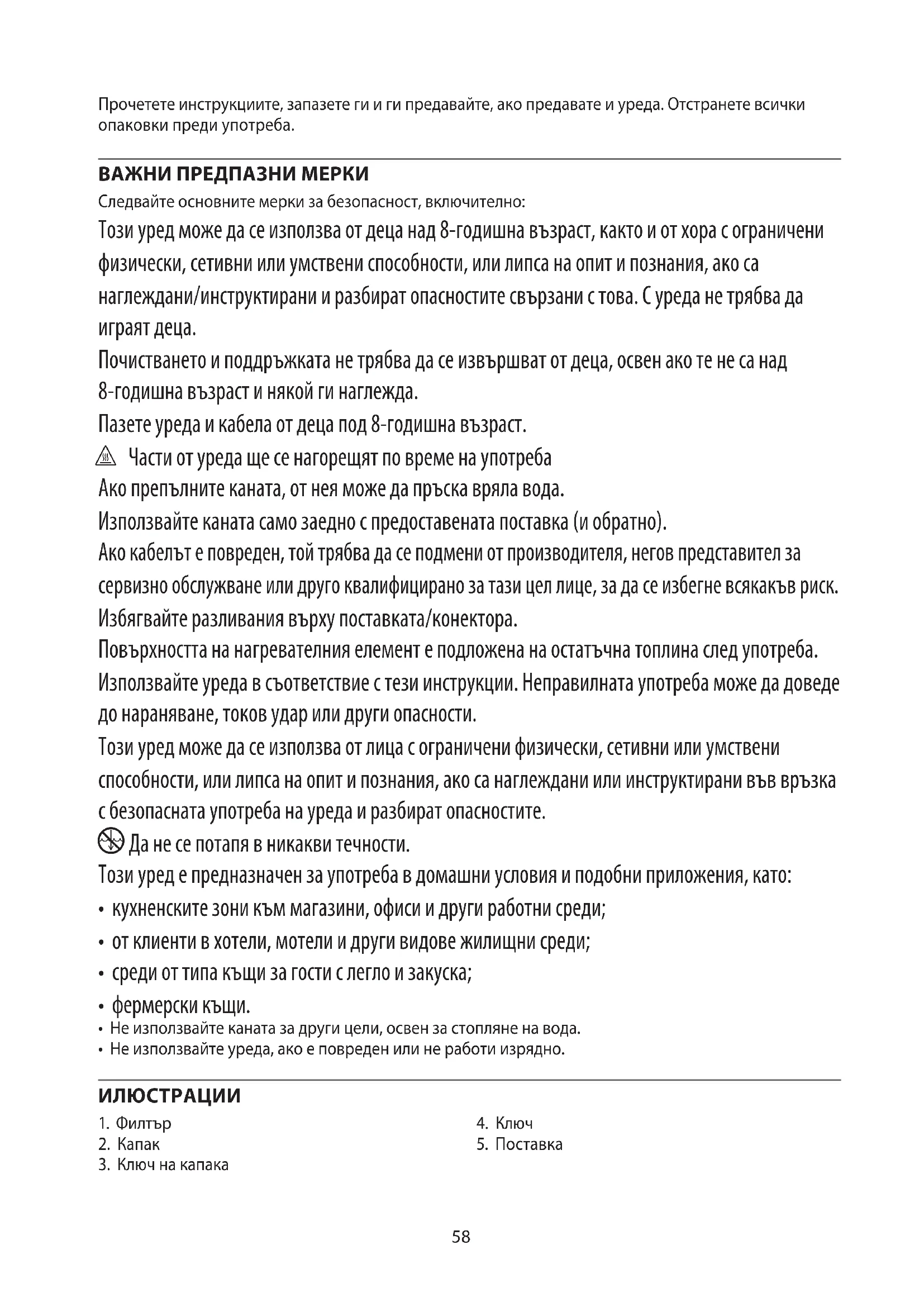 AE58 Прочетете инструкциите, запазете ги и ги предавайте, ако предавате и уреда. Отстранете всички опаковки преди употреба. ВАЖНИ ПРЕДПАЗНИ МЕРКИ Следвайте основните мерки за безопасност, включително: Този уред може да се използва от деца над 8-годишна възраст, както и от хора с ограничени физически, сетивни или умствени способности, или липса на опит и познания, ако са наглеждани/инструктирани и разбират опасностите свързани с това. С уреда не трябва да играят деца. Почистването и поддръжката не трябва да се извършват от деца, освен ако те не са над 8-годишна възраст и някой ги наглежда. Пазете уреда и кабела от деца под 8-годишна възраст. h Части от уреда ще се нагорещят по време на употреба Ако препълните каната, от нея може да пръска вряла вода. Използвайте каната само заедно с предоставената поставка (и обратно). Ако кабелът е повреден, той трябва да се подмени от производителя, негов представител за сервизно обслужване или друго квалифицирано за тази цел лице, за да се избегне всякакъв риск. Избягвайте разливания върху поставката/конектора. Повърхността на нагревателния елемент е подложена на остатъчна топлина след употреба. Използвайте уреда в съответствие с тези инструкции. Неправилната употреба може да доведе до нараняване, токов удар или други опасности. Този уред може да се използва от лица с ограничени физически, сетивни или умствени способности, или липса на опит и познания, ако са наглеждани или инструктирани във връзка с безопасната употреба на уреда и разбират опасностите.