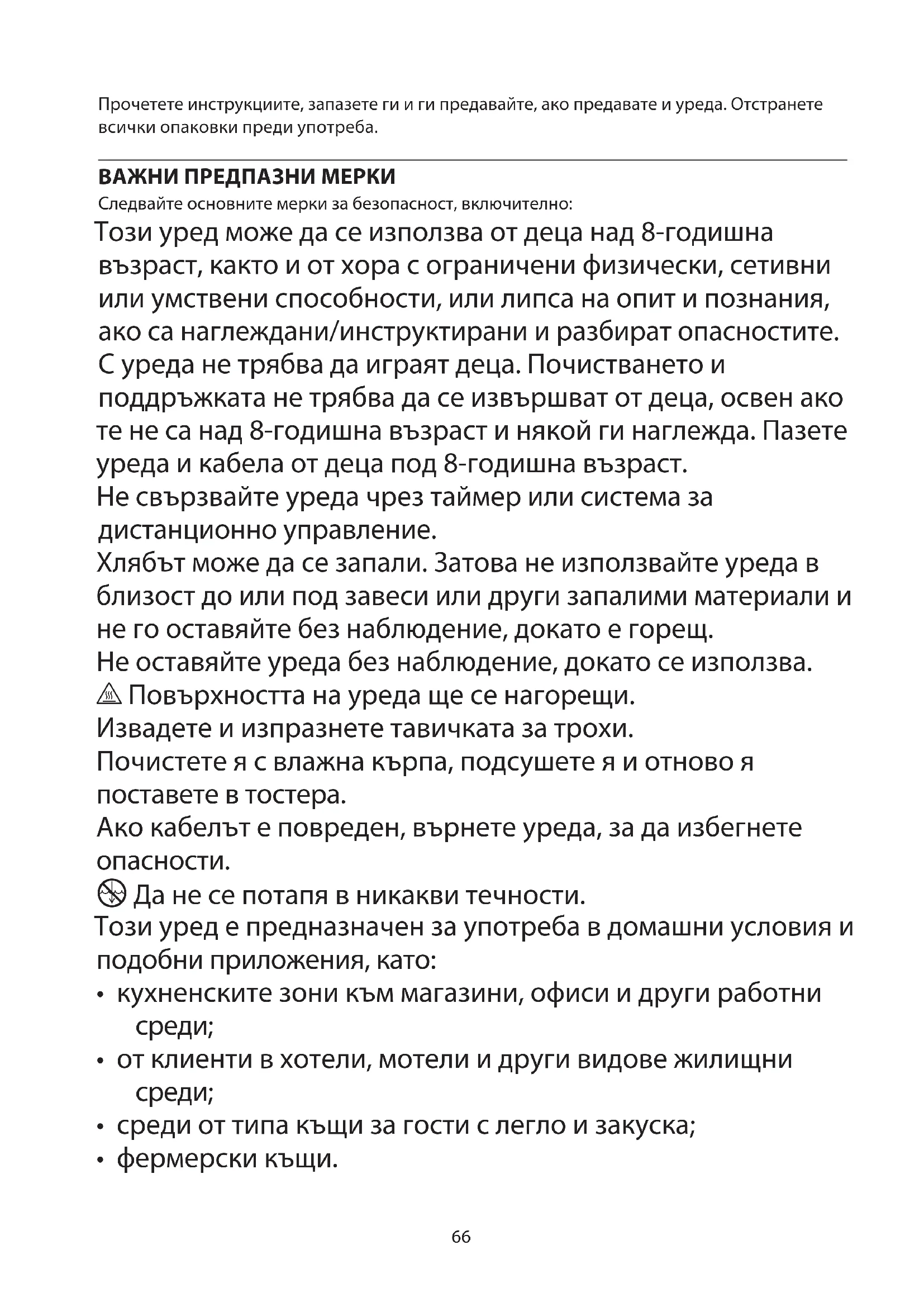 За да се избегнат екологични и здравни проблеми поради наличие на опасни субстанции, уредите, акумулаторните и неакумулаторните батерии, обозначени с един от тези символи, не трябва да се изхвърлят заедно с несортирани общински отпадъци. Винаги изхвърляйте електрически и електронни продукти и, където е приложимо, акумулаторни и неакумулаторни батерии, на подходящо официално място за рециклиране/събиране.69 Прочетете инструкциите, запазете ги и ги предавайте, ако предавате и уреда. Отстранете всички опаковки преди употреба. ВАЖНИ ПРЕДПАЗНИ МЕРКИ Следвайте основните мерки за безопасност, включително: Този уред може да се използва от деца над 8-годишна възраст, както и от хора с ограничени физически, сетивни или умствени способности, или липса на опит и познания, ако са наглеждани/ инструктирани и разбират опасностите. С уреда не трябва да играят деца. Почистването и поддръжката не трябва да се извършват от деца, освен ако те не са над 8-годишна възраст и някой ги наглежда. Пазете уреда и кабела от деца под 8-годишна възраст. Не свързвайте уреда чрез таймер или система за дистанционно управление. Хлябът може да се запали. Затова не използвайте уреда в близост до или под завеси или други запалими материали и не го оставяйте без наблюдение, докато е горещ. h Повърхността на уреда ще се нагорещи. Регулярно виймайте та звільняйте піддон від крихт. Почистете я с влажна кърпа, подсушете я и отново я поставете в тостера. Якщо кабель пошкоджений, поверніть прилад, щоб уникнути небезпеки. i Не занурюйте в будь-яку рідину. Цей прилад призначений для побутового використання та аналогічних сфер застосування, на кшталт: