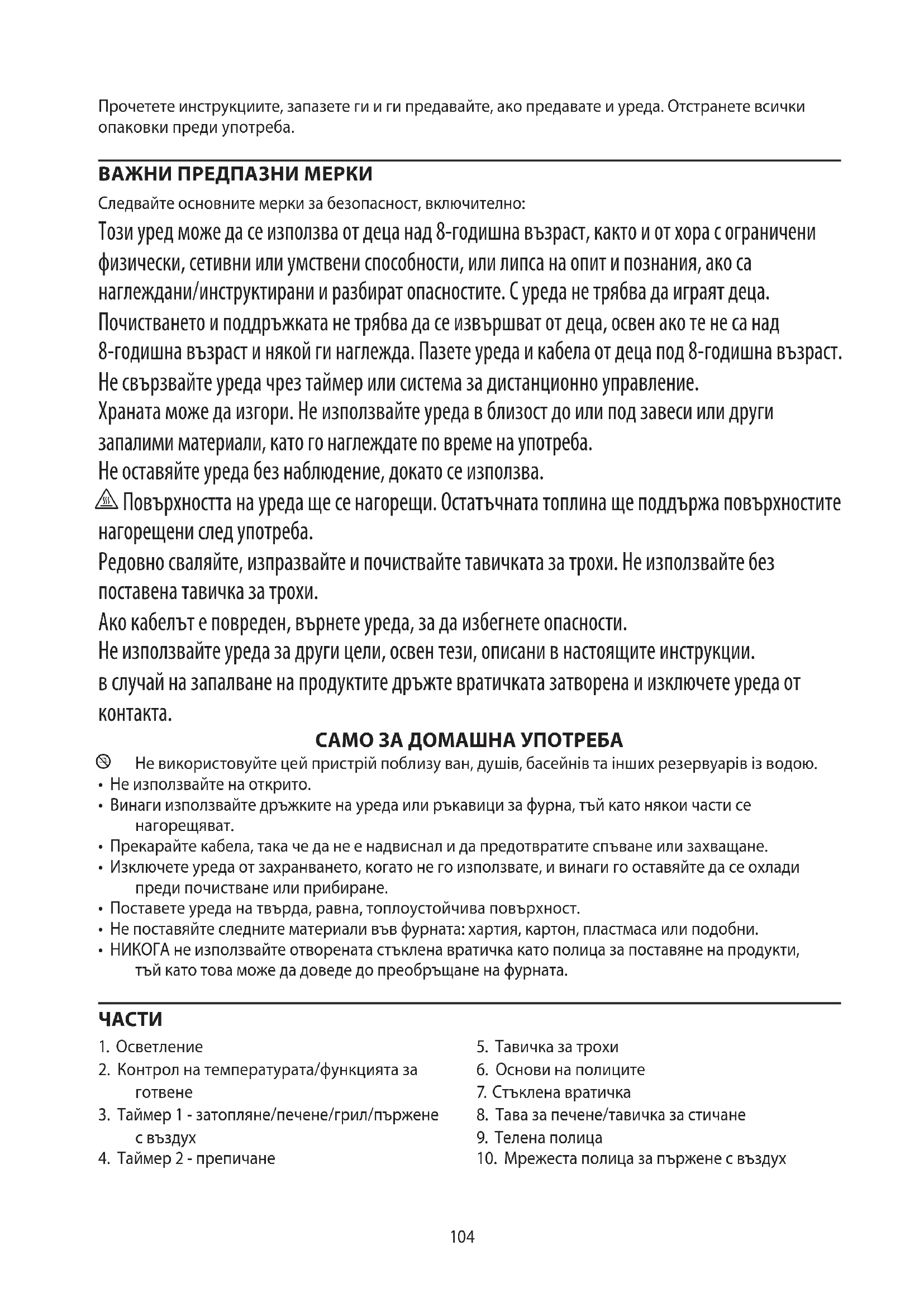 AE104 Прочетете инструкциите, запазете ги и ги предавайте, ако предавате и уреда. Отстранете всички опаковки преди употреба. ВАЖНИ ПРЕДПАЗНИ МЕРКИ Следвайте основните мерки за безопасност, включително: Този уред може да се използва от деца над 8-годишна възраст, както и от хора с ограничени физически, сетивни или умствени способности, или липса на опит и познания, ако са наглеждани/инструктирани и разбират опасностите. С уреда не трябва да играят деца. Почистването и поддръжката не трябва да се извършват от деца, освен ако те не са над 8-годишна възраст и някой ги наглежда. Пазете уреда и кабела от деца под 8-годишна възраст. Не свързвайте уреда чрез таймер или система за дистанционно управление. Храната може да изгори. Не използвайте уреда в близост до или под завеси или други запалими материали, като го наглеждате по време на употреба. Не оставяйте уреда без наблюдение, докато се използва.