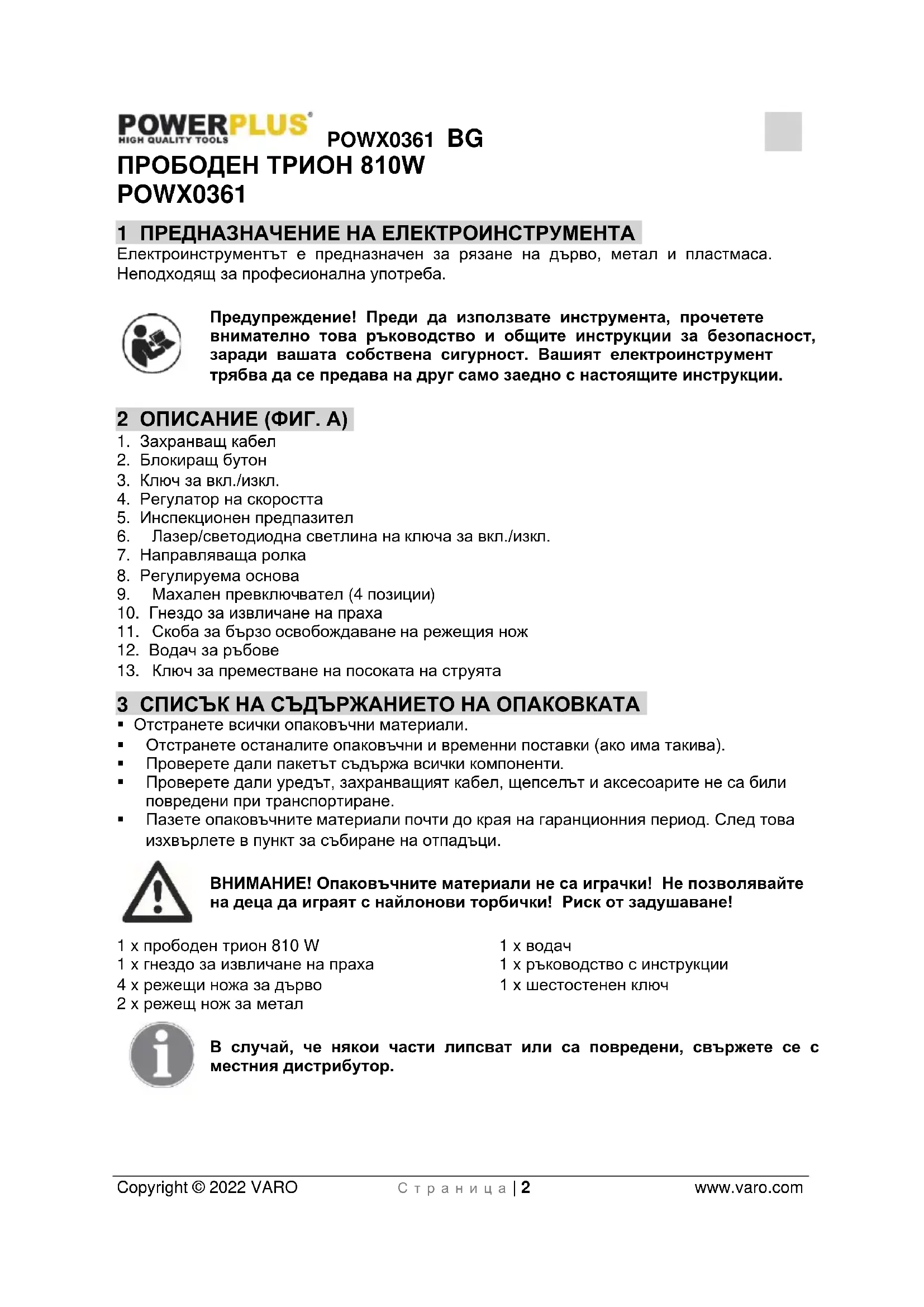 - 12 ДЕКЛАРАЦИЯ ЗА СЪОТВЕТСТВИЕ POWX0361 BG Copyright © 2022 VARO С т р а н и ц а | 2 www.varo.com ПРОБОДЕН ТРИОН 810W POWX0361 1 ПРЕДНАЗНАЧЕНИЕ НА ЕЛЕКТРОИНСТРУМЕНТА Електроинструментът е предназначен за рязане на дърво, метал и пластмаса. Неподходящ за професионална употреба. Предупреждение! Преди да използвате инструмента, прочетете внимателно това ръководство и общите инструкции за безопасност, заради вашата собствена сигурност. Вашият електроинструмент трябва да се предава на друг само заедно с настоящите инструкции. 2 ОПИСАНИЕ (ФИГ. A) p. 9