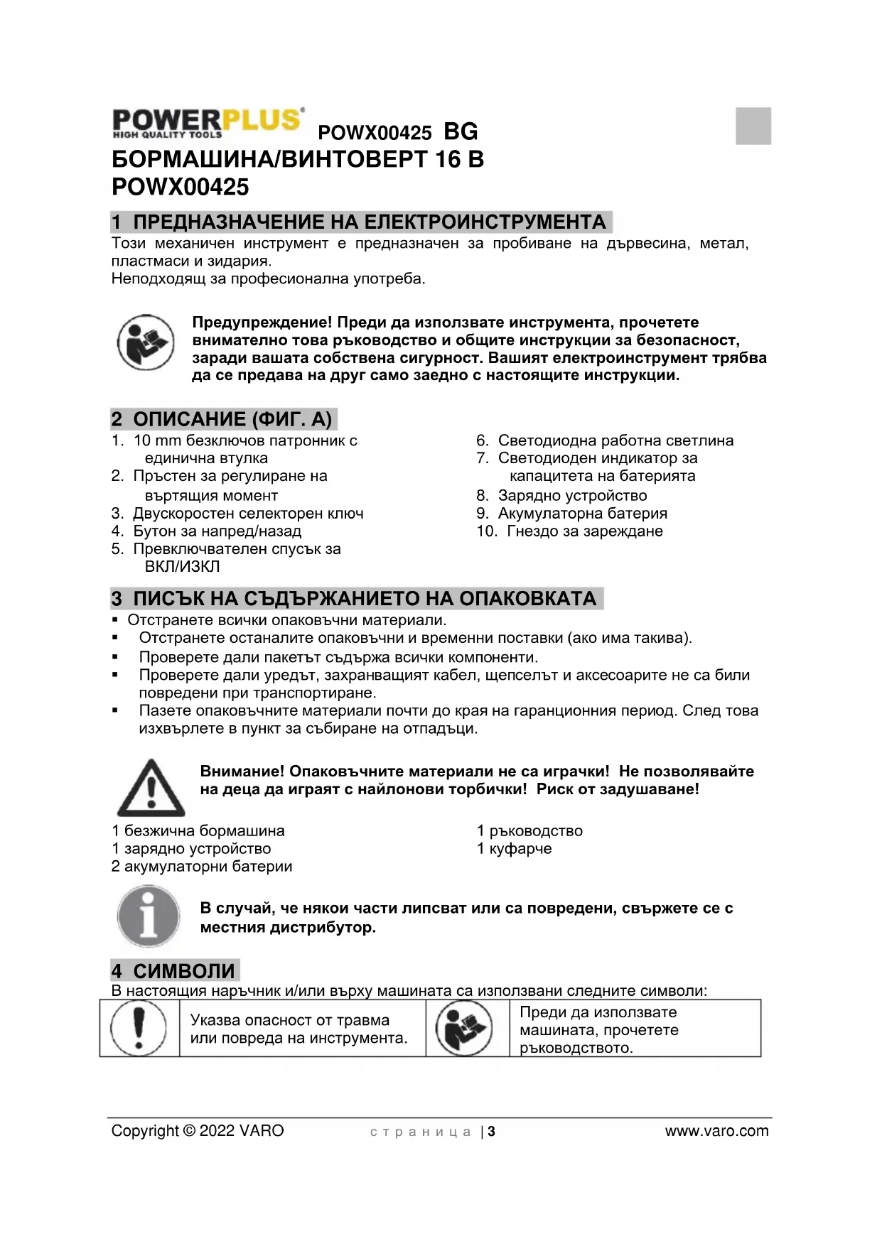 - Вашият инструмент трябва да бъде зареждан най-малко веднъж месечно за осигуряване на оптималната му работа. 14 ОКОЛНА СРЕДА Когато уредът ви трябва да бъде заменен след продължителна употреба, не го изхвърляйте с домакинските отпадъци, а по начин съобразен с опазването на околната среда. Ненужните електрически продукти не трябва да бъдат изхвърляни заедно с домакинските отпадъци. Моля проучете къде има възможности за рециклиране. Поискайте от местните власти или от продавача съвети относно рециклирането.POWX00425 BG Copyright © 2022 VARO с т р а н и ц а | 13 www.varo.com
