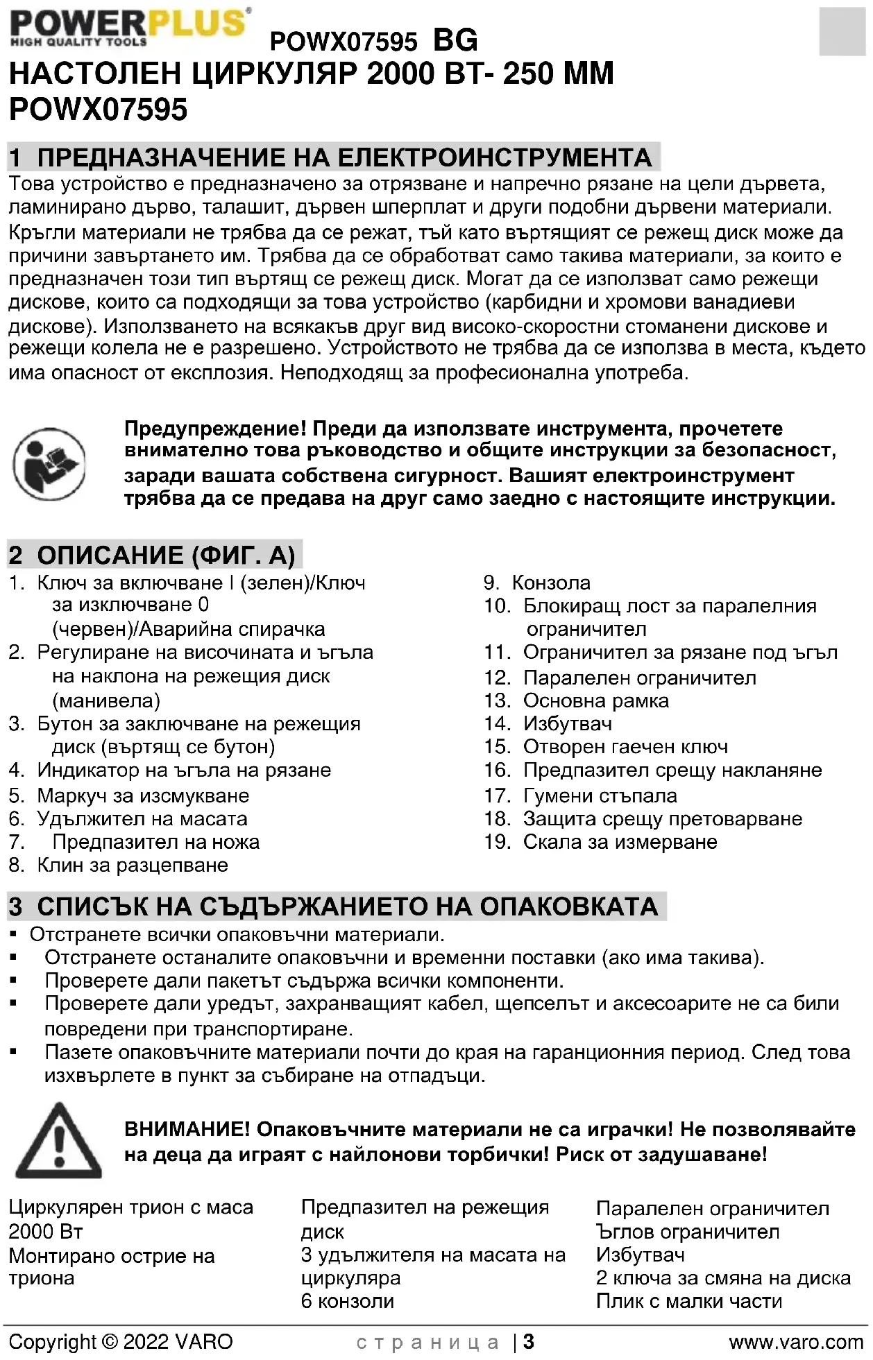 - 10 ТЕХНИЧЕСКИ ХАРАКТЕРИСТИКИ POWX07595 BG Copyright © 2022 VARO с т р а н и ц а | 3 www.varo.com НАСТОЛЕН ЦИРКУЛЯР 2000 ВТ- 250 MM POWX07595 1 ПРЕДНАЗНАЧЕНИЕ НА ЕЛЕКТРОИНСТРУМЕНТА Това устройство е предназначено за отрязване и напречно рязане на цели дървета, ламинирано дърво, талашит, дървен шперплат и други подобни дървени материали. Кръгли материали не трябва да се режат, тъй като въртящият се режещ диск може да причини завъртането им. Трябва да се обработват само такива материали, за които е предназначен този тип въртящ се режещ диск. Могат да се използват само режещи дискове, които са подходящи за това устройство (карбидни и хромови ванадиеви дискове). Използването на всякакъв друг вид високо-скоростни стоманени дискове и режещи колела не е разрешено. Устройството не трябва да се използва в места, където има опасност от експлозия. Неподходящ за професионална употреба. Предупреждение! Преди да използвате инструмента, прочетете внимателно това ръководство и общите инструкции за безопасност, заради вашата собствена сигурност. Вашият електроинструмент трябва да се предава на друг само заедно с настоящите инструкции. 2 ОПИСАНИЕ (ФИГ. A) p. 13