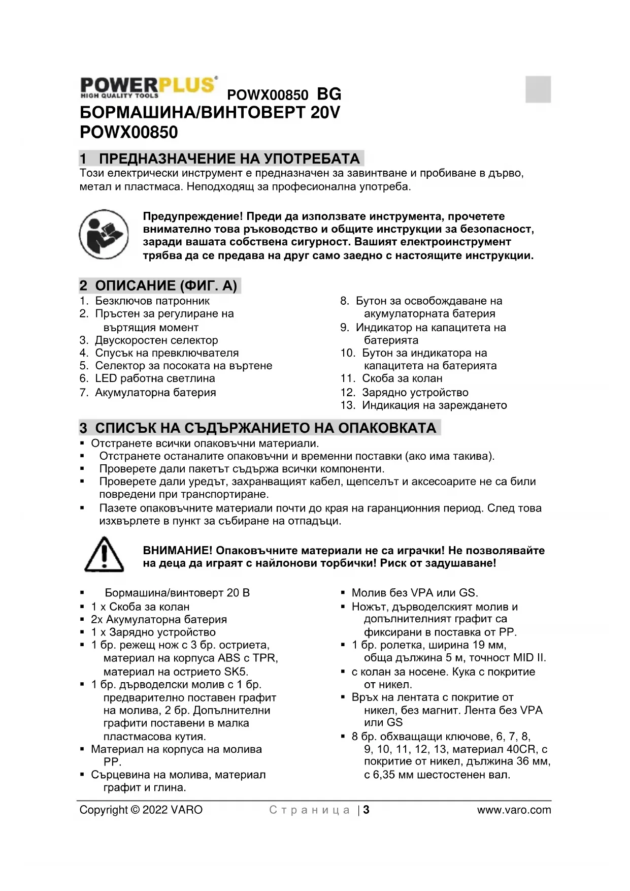 - Презареждайте само с определеното от производителя зарядно устройство. Зарядно устройство, което е подходящо за един тип акумулаторна батерия може да създаде риск от пожар, когато се използва с друга зарядна батерия.POWX00850 BG Copyright © 2022 VARO С т р а н и ц а | 7 www.varo.com