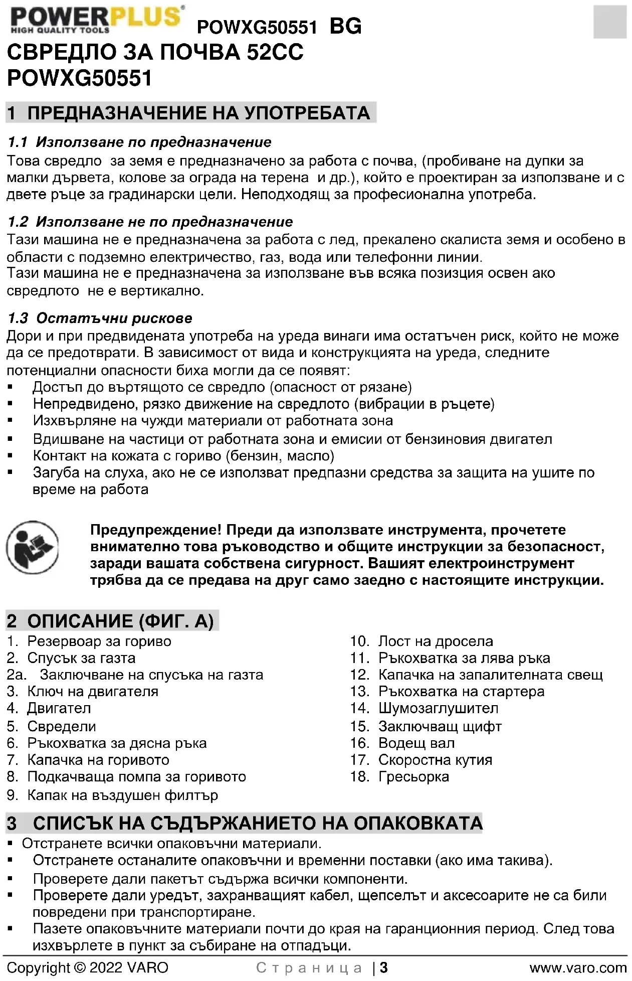 - 15 ДЕКЛАРАЦИЯ ЗА СЪОТВЕТСТВИЕ POWXG50551 BG Copyright © 2022 VARO С т р а н и ц а | 3 www.varo.com СВРЕДЛО ЗА ПОЧВА 52CC POWXG50551 1 ПРЕДНАЗНАЧЕНИЕ НА УПОТРЕБАТА p. 12