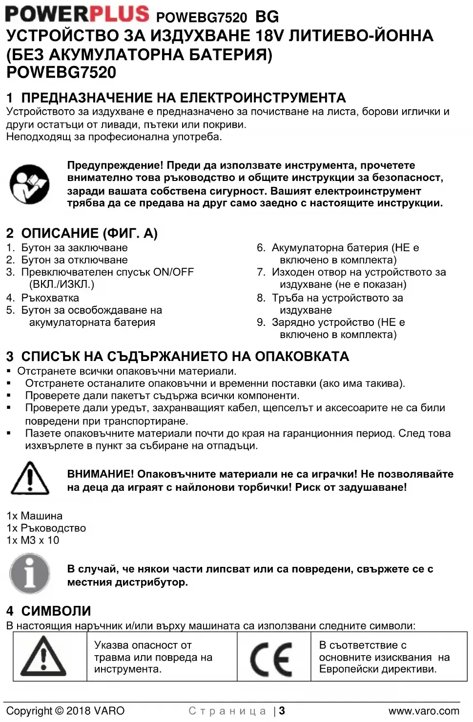 - Вашият инструмент трябва да бъде зареждан най-малко веднъж месечно за осигуряване на оптималната му работа. 16 ОКОЛНА СРЕДА Когато уредът ви трябва да бъде заменен след продължителна употреба, не го изхвърляйте с домакинските отпадъци, а по начин съобразен с опазването на околната среда. Отпадъците от електрически продукти не трябва да бъдат изхвърляни заедно с домакинските отпадъци. Моля, проучете къде има възможности за рециклиране. Поискайте от местните власти или от продавача съвети относно рециклирането.POWEBG7520 BG Copyright © 2018 VARO С т р а н и ц а | 11 www.varo.com 17 ДЕКЛАРАЦИЯ ЗА СЪОТВЕТСТВИЕ VARO N.V. – VARO N.V. – Joseph Van Instraat 9 – BE2500 Lier – Белгия декларират, че продукт: Устройство за издухване марка: POWERplus модел: POWEBG7520 е в съответствие с основните изисквания и други съответни разпоредби на приложимите Европейски директиви, базирани върху прилагането на Европейските хармонизирани стандарти. Всяка неупълномощена модификация на апарата анулира тази декларация. Европейски директиви (включително техните промени към датата на подписване, ако са приложими): 2011/65/EU 2006/42/EC 2014/30/EU 2000/14/EC Annex V LwA 91dB(A) / 95dB(A) Европейски хармонизирани стандарти (включително техните промени към датата на подписване, ако са приложими): EN60335-1: 2012 EN50636-2-100: 2014 EN62233: 2008 EN55014-1: 2006 EN55014-2: 2015 Съхранител на техническата документация: Филип Ванкеркхов, VARO – Vic. Van Rompuy N.V. Долуподписаният действа от името на Изпълнителния директор на компанията, Eric de Boer Регулационни въпроси – мениджър по съответствията 24/10/2017POWEBG7520 ET Copyright © 2018 VARO Lk | 1 www.varo.com 1 OTSTARVE ..................................................................................... 3