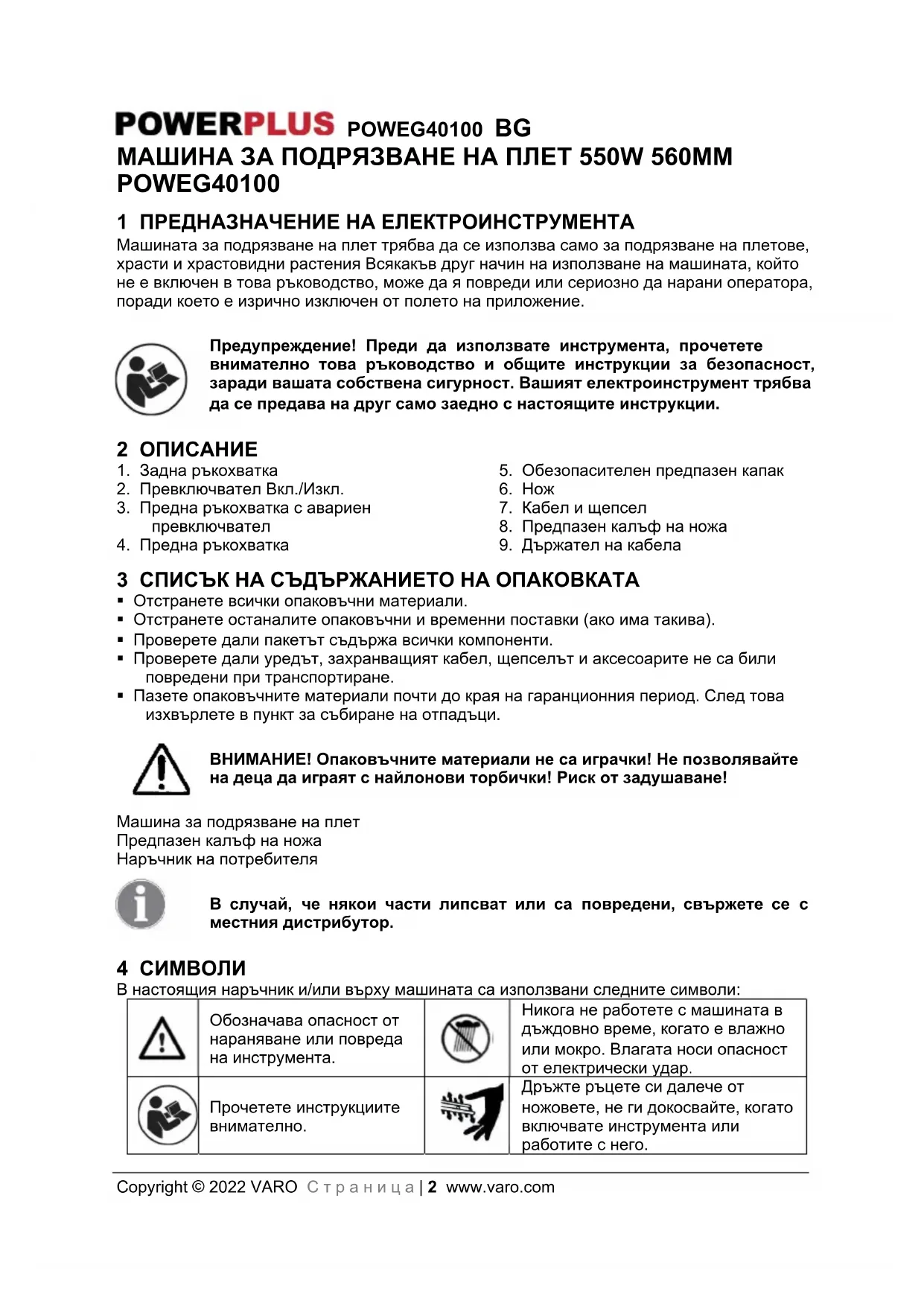 - 16 ДЕКЛАРАЦИЯ ЗА СЪОТВЕТСТВИЕ POWEG40100 BG Copyright © 2022 VARO С т р а н и ц а | 2 www.varo.com МАШИНА ЗА ПОДРЯЗВАНЕ НА ПЛЕТ 550W 560MM POWEG40100 1 ПРЕДНАЗНАЧЕНИЕ НА ЕЛЕКТРОИНСТРУМЕНТА Машината за подрязване на плет трябва да се използва само за подрязване на плетове, храсти и храстовидни растения Всякакъв друг начин на използване на машината, който не е включен в това ръководство, може да я повреди или сериозно да нарани оператора, поради което е изрично изключен от полето на приложение. Предупреждение! Преди да използвате инструмента, прочетете внимателно това ръководство и общите инструкции за безопасност, заради вашата собствена сигурност. Вашият електроинструмент трябва да се предава на друг само заедно с настоящите инструкции. 2 ОПИСАНИЕ p. 9