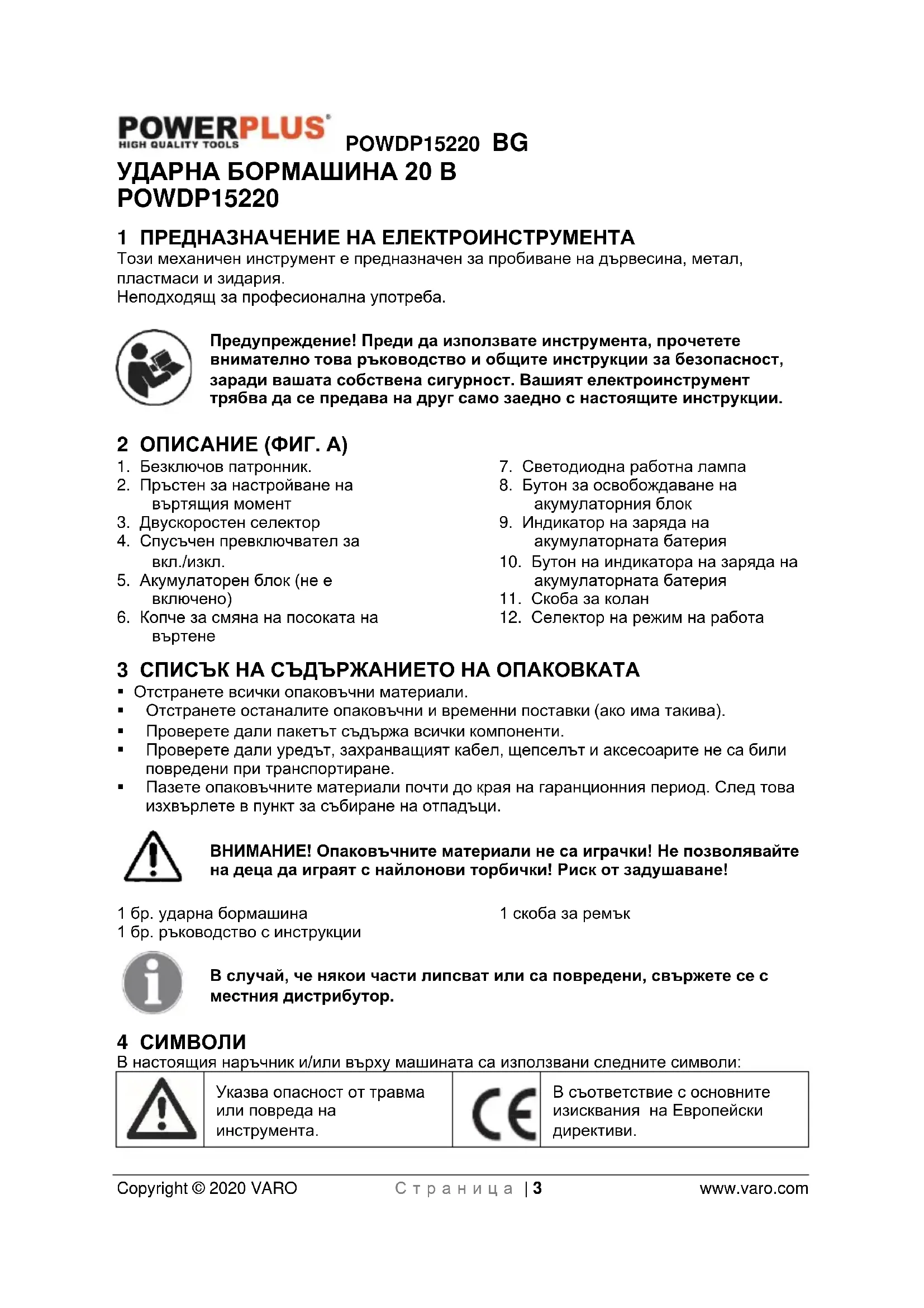 - Вашият инструмент трябва да бъде зареждан най-малко веднъж месечно за осигуряване на оптималната му работа. 15 ОКОЛНА СРЕДА Когато уредът ви трябва да бъде заменен след продължителна употреба, не го изхвърляйте с домакинските отпадъци, а по начин съобразен с опазването на околната среда. Отпадъците от електрически продукти не трябва да бъдат изхвърляни заедно с домакинските отпадъци. Моля, проучете къде има възможности за рециклиране. Поискайте от местните власти или от продавача съвети относно рециклирането.POWDP15220 BG Copyright © 2020 VARO С т р а н и ц а | 15 www.varo.com 16 ДЕКЛАРАЦИЯ ЗА СЪОТВЕТСТВИЕ VARO – Vic. Van Rompuy N.V. – Joseph Van Instraat 9 – BE2500 Lier – Белгия декларират, че продукт: Ударна бормашина 20 В марка: PowerPlus модел: POWDP15220 е в съответствие с основните изисквания и други съответни разпоредби на приложимите Европейски директиви, базирани върху прилагането на Европейските хармонизирани стандарти. Всяка неупълномощена модификация на апарата анулира тази декларация. Европейски директиви (включително техните промени към датата на подписване, ако са приложими): 2011/65/EU 2006/42/EC 2014/30/EU Европейски хармонизирани стандарти (включително техните промени към датата на подписване, ако са приложими): EN62841-1 : 2015 EN62841-2-1 : 2018 EN55014-1 : 2017 EN55014-2 : 2015 Съхранител на техническата документация: Филип Ванкеркхов, VARO – Vic. Van Rompuy N.V. Долуподписаният действа от името на Изпълнителния директор на компанията, Ludo Mertens Регулационни въпроси – мениджър по съответствията 11/08/2020, Lier - BelgiumWWW.VARO.COM
