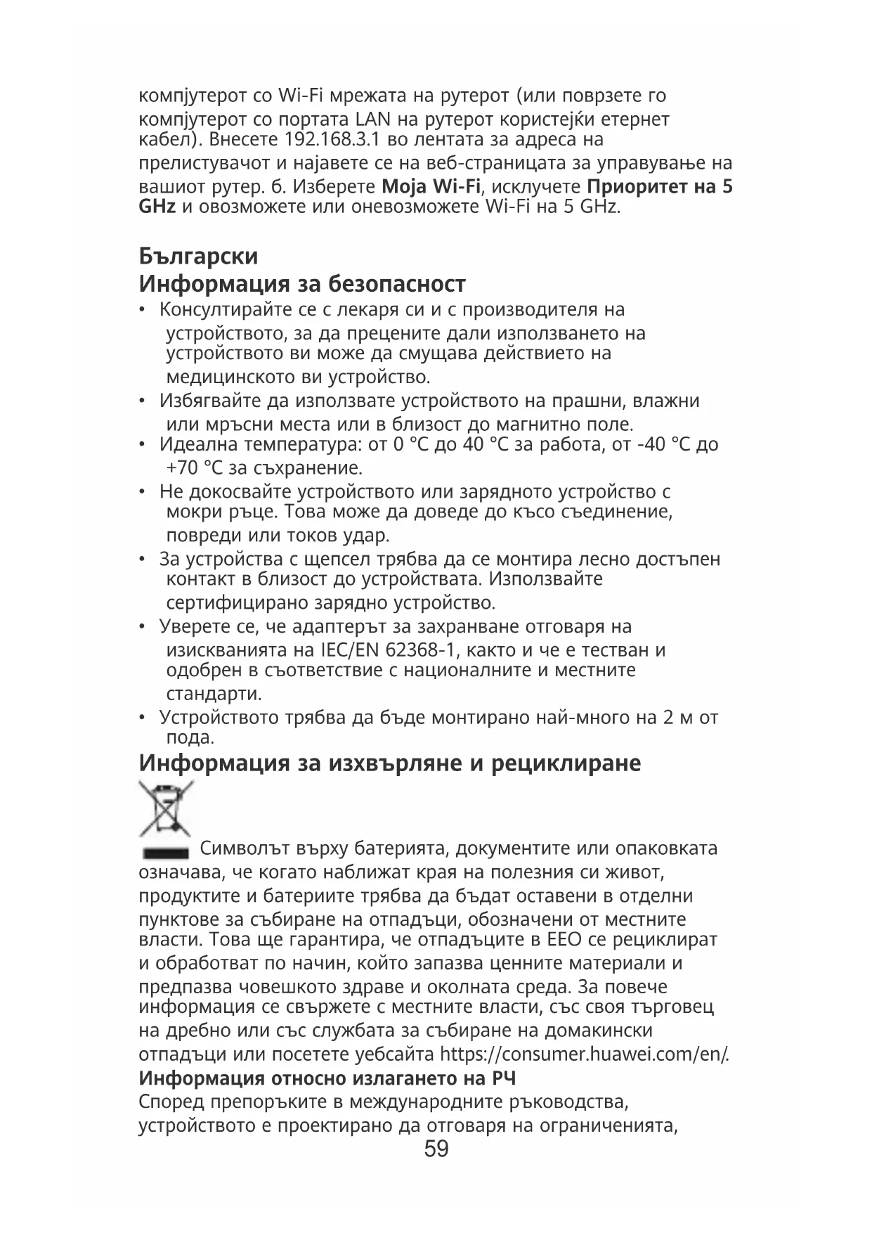 Информация за изхвърляне и рециклиране Символът върху батерията, документите или опаковката означава, че когато наближат края на полезния си живот, продуктите и батериите трябва да бъдат оставени в отделни пунктове за събиране на отпадъци, обозначени от местните власти. Това ще гарантира, че отпадъците в ЕЕО се рециклират и обработват по начин, който запазва ценните материали и предпазва човешкото здраве и околната среда. За повече информация се свържете с местните власти, със своя търговец на дребно или със службата за събиране на домакински отпадъци или посетете уебсайта https://consumer.huawei.com/en/