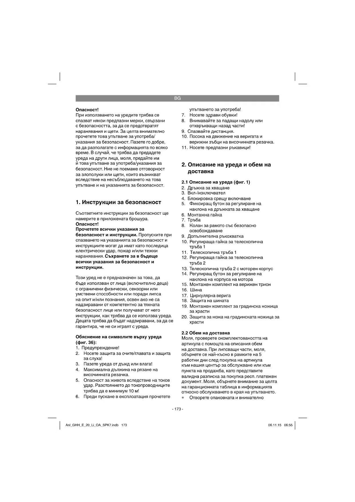 и акумулатора в нашата сервизна служба. В интерес на един дълъг срок на експлоатация на акумулатора следва да се погрижете за своевременното повторно зареждане на акумулатора. То ва във всеки случай е необходимо, ако установите, че мощността на акумулаторния уред намалява. Никога не изпразвайте изцяло акумулатора. Това води до дефект на акумулатора! Anl_GHH_E_20_Li_OA_SPK7.indb 178Anl_GHH_E_20_Li_OA_SPK7.indb 178 06.11.15 06:5506.11.15 06:55BG