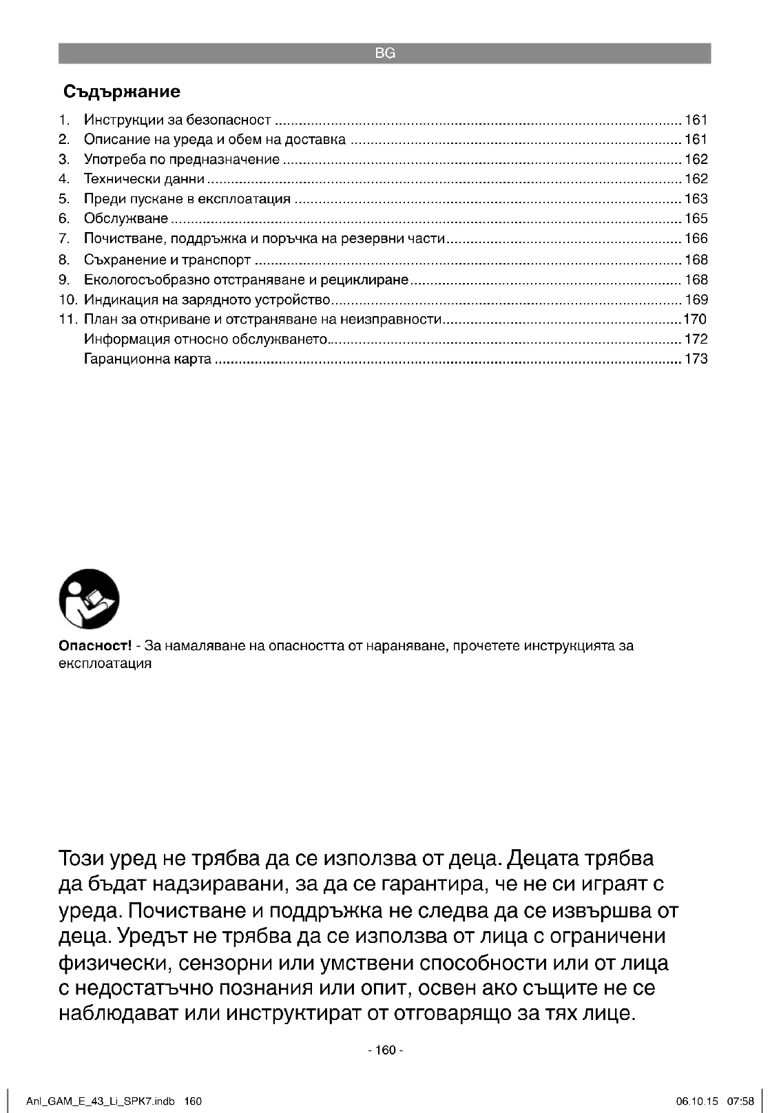 - Този уред не трябва да се използва от деца. Децата трябва да бъдат надзиравани, за да се гарантира, че не си играят с уреда. Почистване и поддръжка не следва да се извършва от деца. Уредът не трябва да се използва от лица с ограничени физически, сензорни или умствени способности или от лица с недостатъчно познания или опит, освен ако същите не се наблюдават или инструктират от отговарящо за тях лице. 1. Инструкции за безопасност p. 161