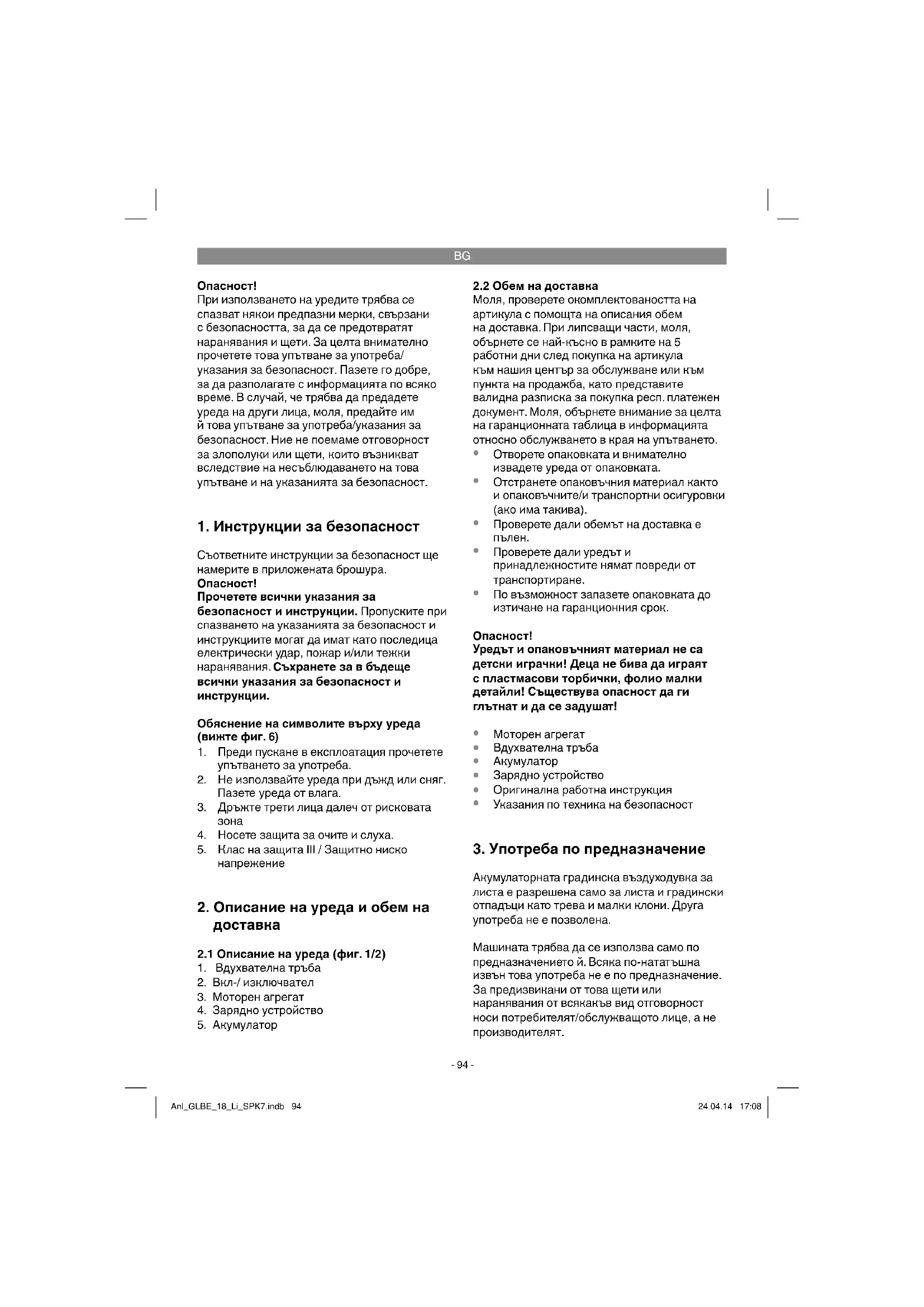 Акумулаторната градинска въздуходувка за листа е разрешена само за листа и градински отпадъци като трева и малки клони. Друга употреба не е позволена. Машината трябва да се използва само по предназначението й. Всяка по-нататъшна извън това употреба не е по предназначение. За предизвикани от това щети или наранявания от всякакъв вид отговорност носи потребителят/обслужващото лице, а не производителят. Anl_GLBE_18_Li_SPK7.indb 94Anl_GLBE_18_Li_SPK7.indb 94 24.04.14 17:0824.04.14 17:08BG