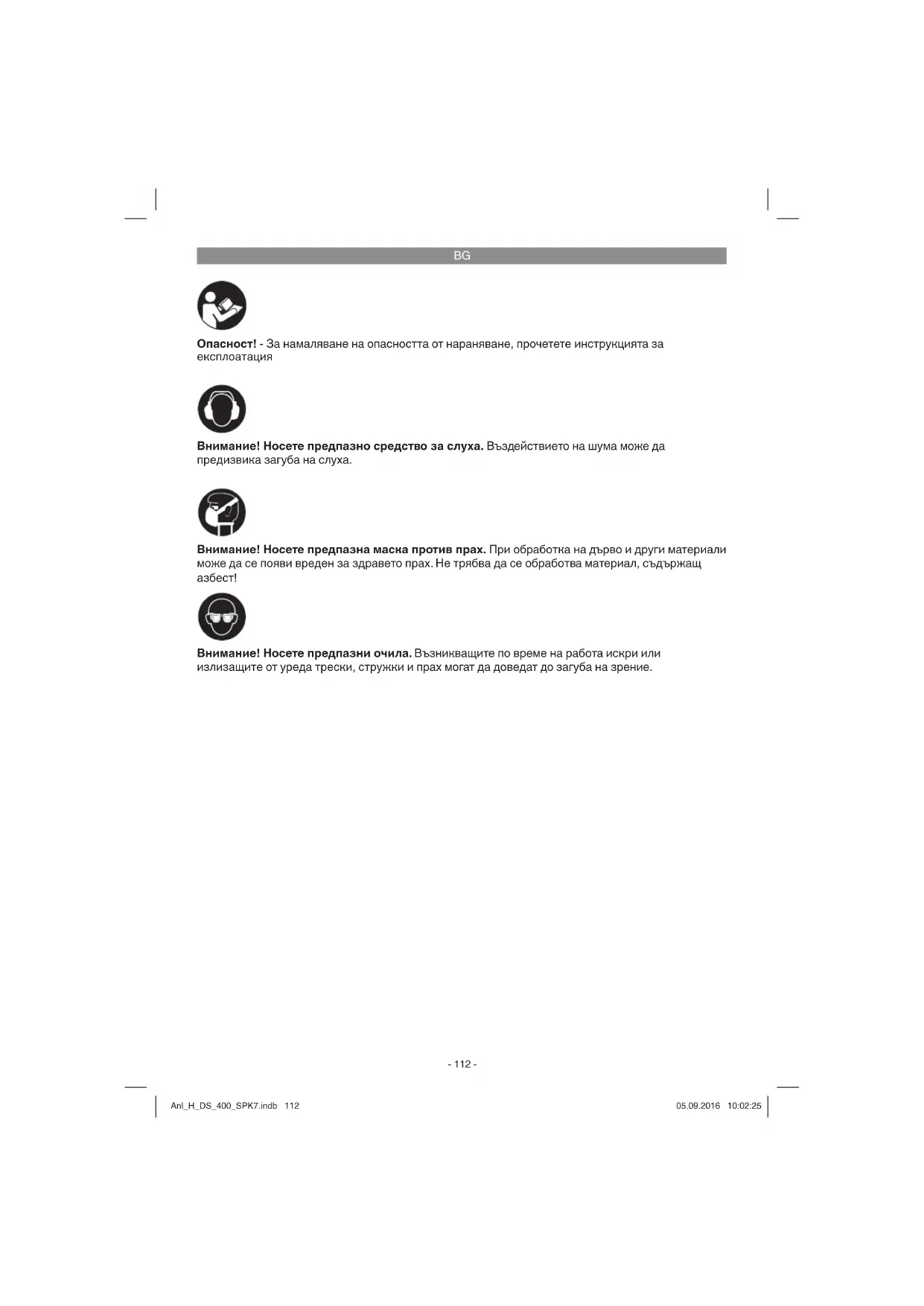 Опасност! - За намаляване на опасността от нараняване, прочетете инструкцията за експлоатация Внимание! Носете предпазно средство за слуха. Въздействието на шума може да предизвика загуба на слуха. Внимание! Носете предпазни очила. Възникващите по време на работа искри или излизащите от уреда трески, стружки и прах могат да доведат до загуба на зрение. Внимание! Носете предпазна маска против прах. При обработка на дърво и други материали може да се появи вреден за здравето прах. Не трябва да се обработва материал, съдържащ