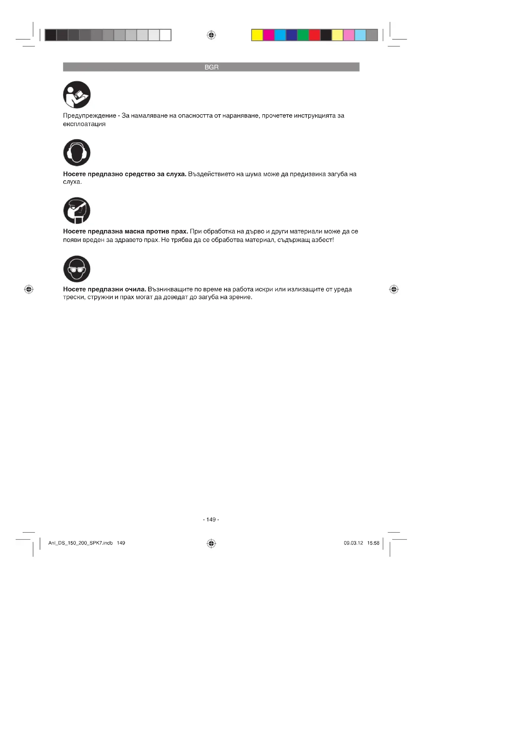 Носете предпазни очила. Възникващите по време на работа искри или излизащите от уреда трески, стружки и прах могат да доведат до загуба на зрение. Носете предпазна маска против прах. При обработка на дърво и други материали може да се появи вреден за здравето прах. Не трябва да се обработва материал, съдържащ азбест! Anl_DS_150_200_SPK7.indb 149Anl_DS_150_200_SPK7.indb 149 09.03.12 15:5809.03.12 15:58BGR