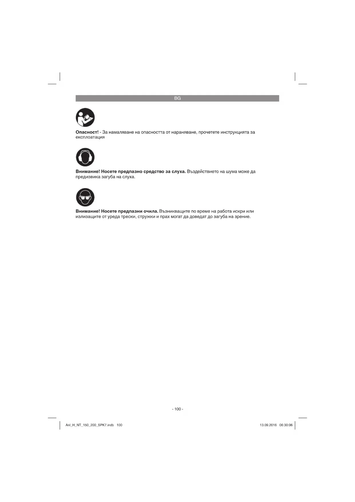 Опасност! - За намаляване на опасността от нараняване, прочетете инструкцията за експлоатация Внимание! Носете предпазно средство за слуха. Въздействието на шума може да предизвика загуба на слуха. Внимание! Носете предпазни очила. Възникващите по време на работа искри или излизащите от уреда трески, стружки и прах могат да доведат до загуба на зрение. Anl_H_NT_150_200_SPK7.indb 100Anl_H_NT_150_200_SPK7.indb 100 13.09.2016 06:30:0613.09.2016 06:30:06BG