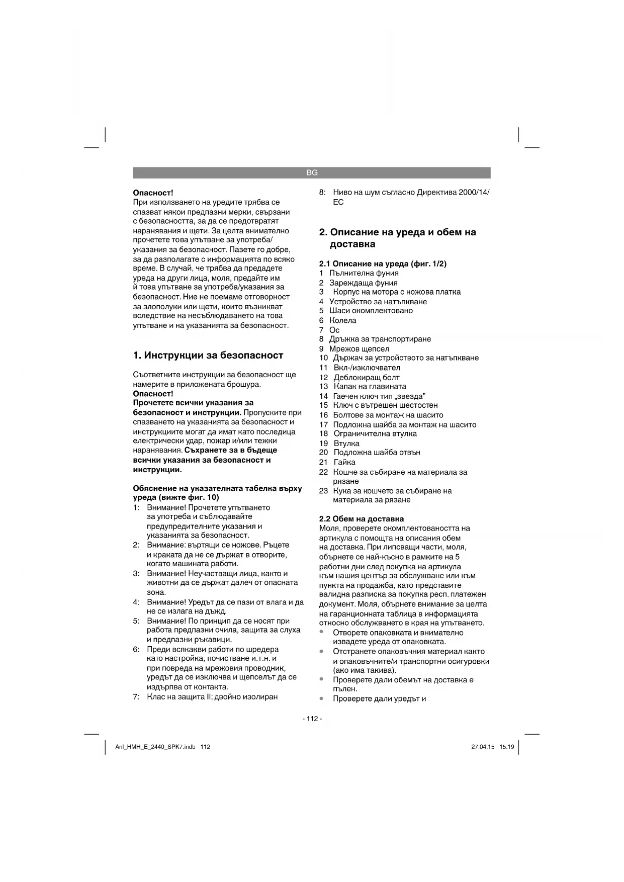 Увяхнали, влажни, поставени вече няколко дни градински отпадъци трябва да се раздробяват като се редуват с клони. Посредством това се избягва наслояване на материала за рязане в Anl_HMH_E_2440_SPK7.indb 114Anl_HMH_E_2440_SPK7.indb 114 27.04.15 15:1927.04.15 15:19BG