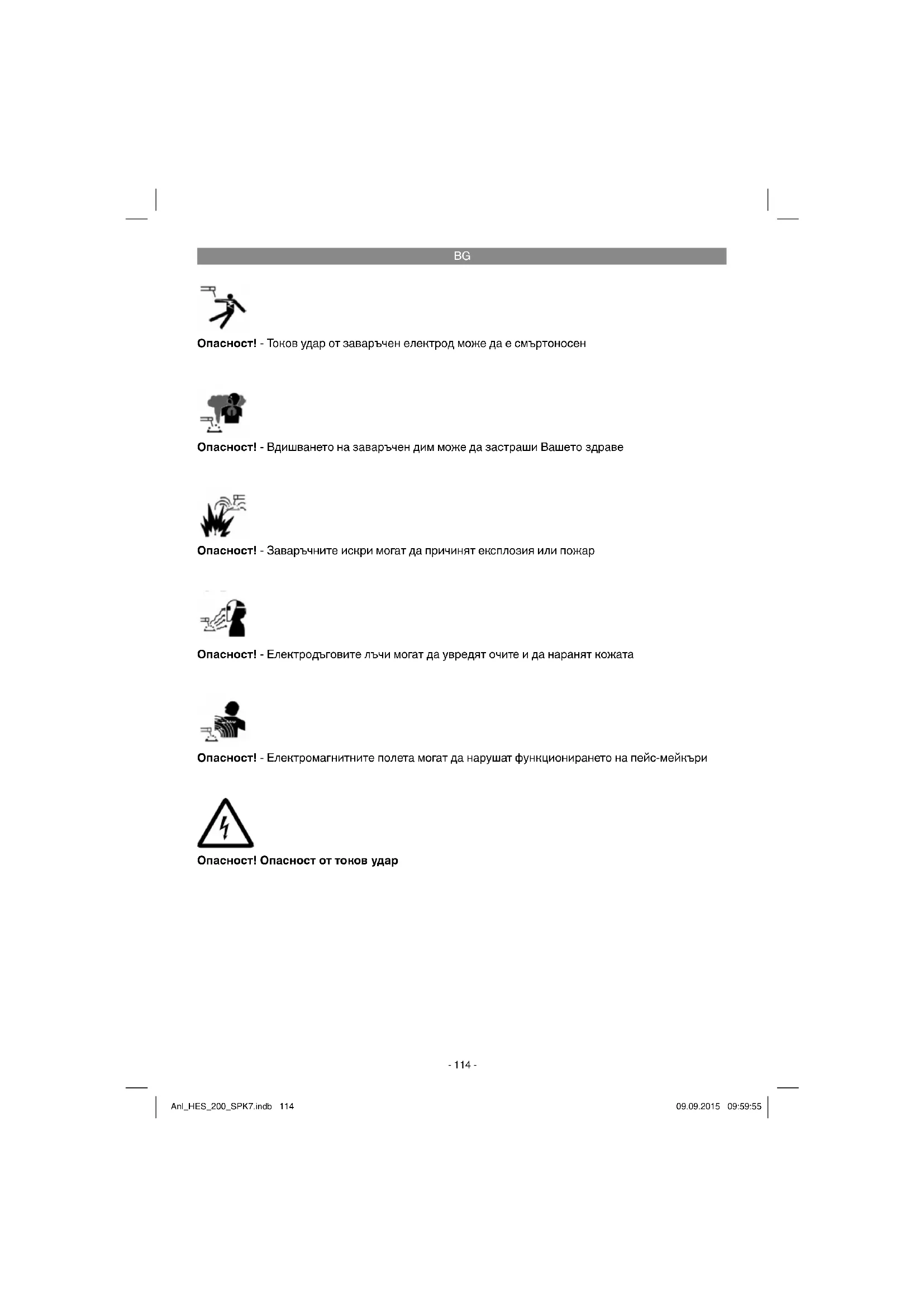 Опасност! - Токов удар от заваръчен електрод може да е смъртоносен Опасност! - Вдишването на заваръчен дим може да застраши Вашето здраве Опасност! - Електродъговите лъчи могат да увредят очите и да наранят кожата Опасност! - Заваръчните искри могат да причинят експлозия или пожар Опасност! - Електромагнитните полета могат да нарушат функционирането на пейс-мейкъри Опасност! Опасност от токов удар Anl_HES_200_SPK7.indb 114Anl_HES_200_SPK7.indb 114 09.09.2015 09:59:5509.09.2015 09:59:55BG