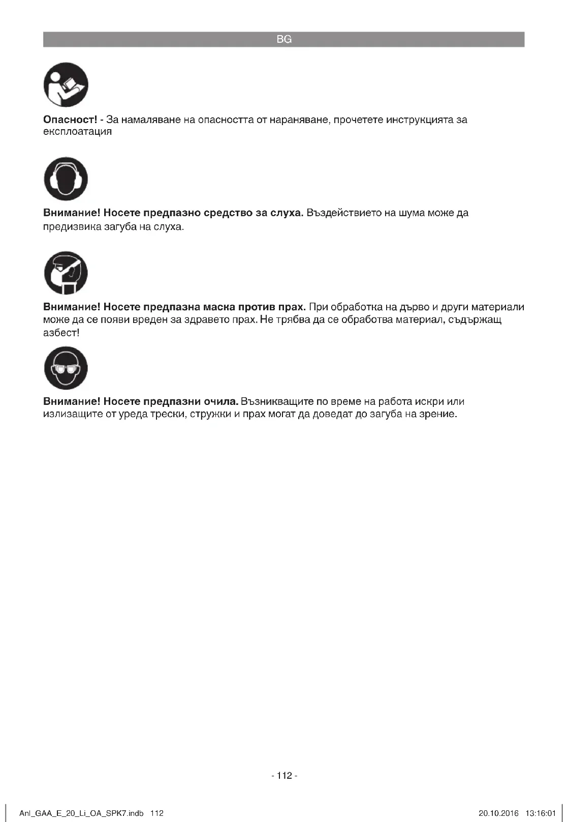 Опасност! - За намаляване на опасността от нараняване, прочетете инструкцията за експлоатация Внимание! Носете предпазно средство за слуха. Въздействието на шума може да предизвика загуба на слуха. Внимание! Носете предпазни очила. Възникващите по време на работа искри или излизащите от уреда трески, стружки и прах могат да доведат до загуба на зрение. Внимание! Носете предпазна маска против прах. При обработка на дърво и други материали може да се появи вреден за здравето прах. Не трябва да се обработва материал, съдържащ