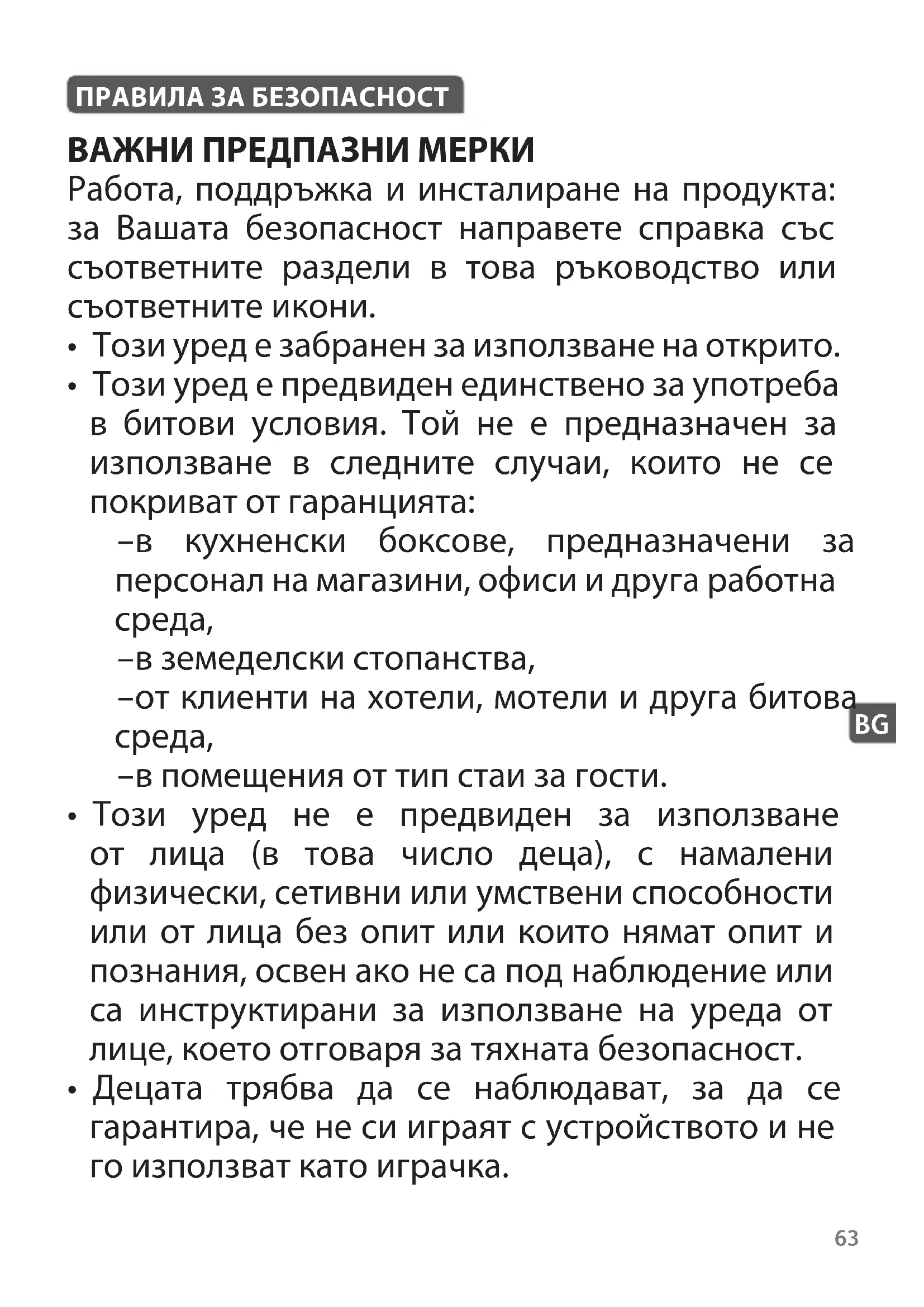 - Децата трябва да се наблюдават, за да се гарантира, че не си играят с устройството и не го използват като играчка. ПРАВИЛА ЗА БЕЗОПАСНОСТ 63• Температурата на откритите повърхности може да се повиши, когато уредът работи.