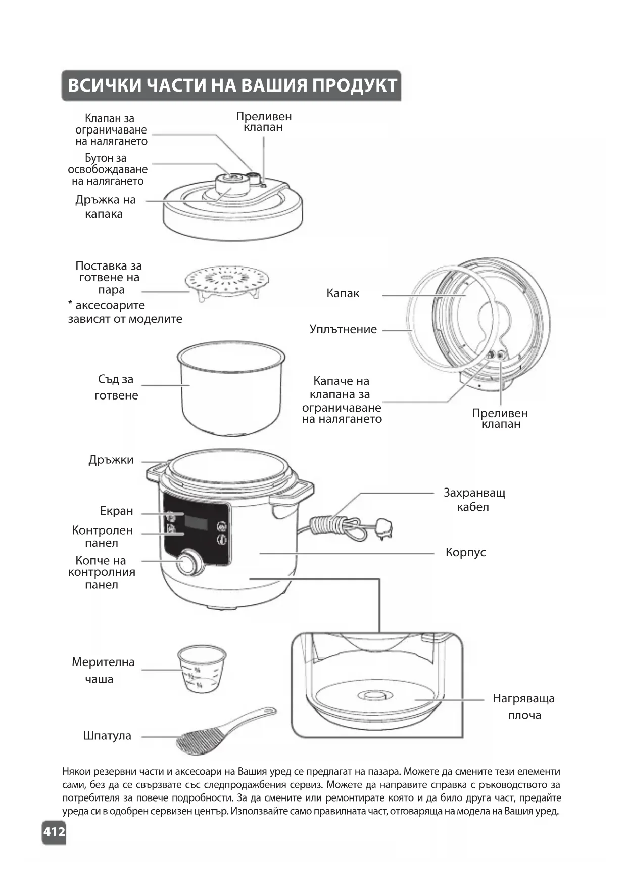 - аксесоарите зависят от моделите ВСИЧКИ ЧАСТИ НА ВАШИЯ ПРОДУКТ Някои резервни части и аксесоари на Вашия уред се предлагат на пазара. Можете да смените тези елементи сами, без да се свързвате със следпродажбения сервиз. Можете да направите справка с ръководството за потребителя за повече подробности. За да смените или ремонтирате която и да било друга част, предайте уреда си в одобрен сервизен център. Използвайте само правилната част, отговаряща на модела на Вашия уред.413