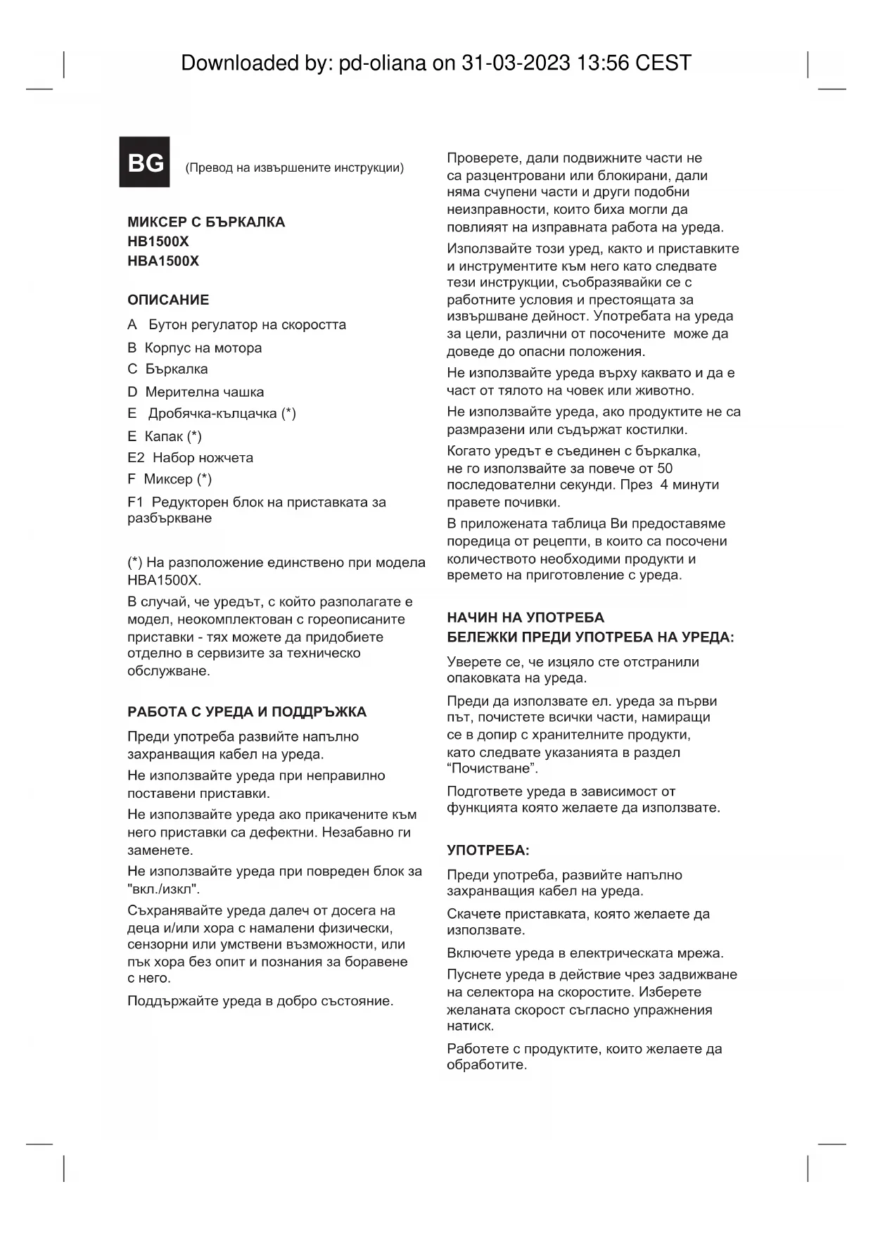 A Бутон регулатор на скоростта B Корпус на мотора C Бъркалка D Мерителна чашка E Дробячка-кълцачка (*) E Капак (*) E2 Набор ножчета F Миксер (*) F1 Редукторен блок на приставката за разбъркване (*) На разположение единствено при моделa HBA1500X. В случай, че уредът, с който разполагате е модел, неокомплектован с гореописаните приставки - тях можете да придобиете отделно в сервизите за техническо обслужване. РАБОТА С УРЕДА И ПОДДРЪЖКА Преди употреба развийте напълно захранващия кабел на уреда. Не използвайте уреда при неправилно поставени приставки. Не използвайте уреда ако прикачените към него приставки са дефектни. Незабавно ги